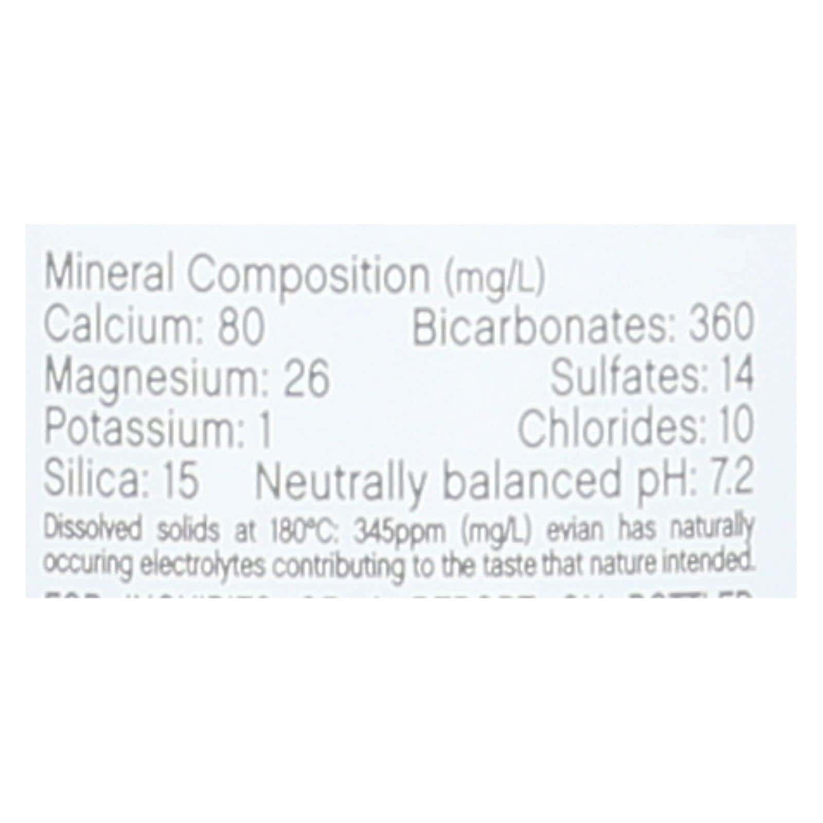 EVIAN NATURAL SPRING WATER HAS NATURALLY OCCURRING ELECTROLYTES THAT CONTRIBUTE TO THE TASTE THAT NATURE INTENDED. COMING STRAIGHT FROM THE SOURCE HIGH IN THE FRENCH ALPS, THIS FRESH-TASTING WATER IS CLEAR, PURE AND EXACTLY HOW YOU WANT YOUR WATER TO BE. EACH BOTTLE OF EVIAN NATURAL SPRING WATER CONTAINS 500 ML.