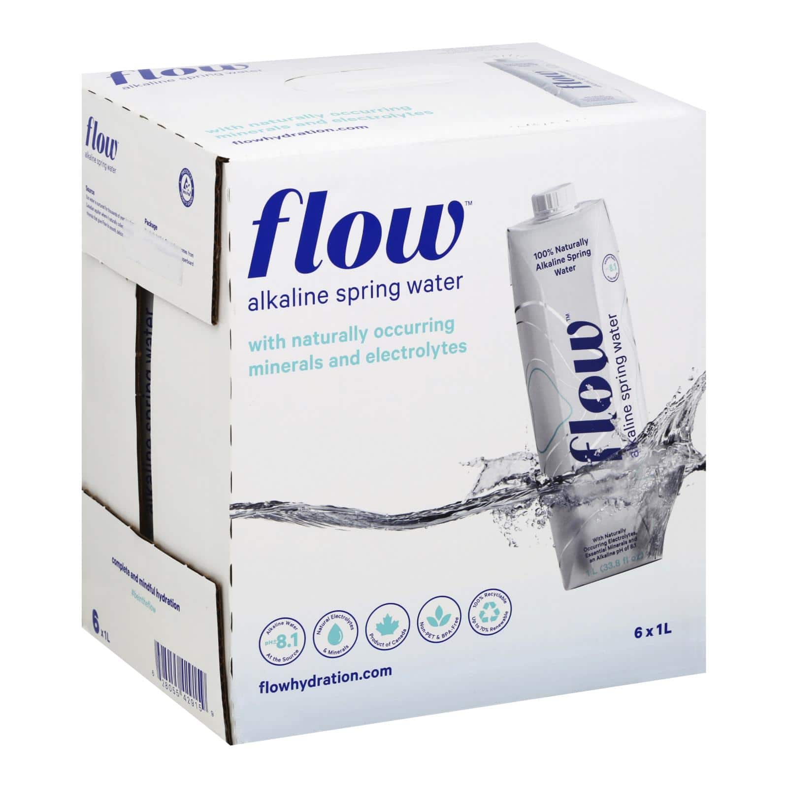 FLOW WATER 100% NATURALLY ALKALINE SPRING WATER HAS NATURALLY OCCURRING ESSENTIAL MINERALS THAT GIVE IT A BASIC PH AND A SMOOTH, REFRESHING TASTE. THIS 6 COUNT BOX OF FLOW WATER MAKES SHARING EASY, AND EACH 1 L BOTTLE PROVIDES LOTS OF LIQUID REFRESHMENT TO LAST THROUGH AN INTENSE WORKOUT OR LONG, ACTIVE DAY. WE ESCHEW PLASTIC BOTTLES AND PACKAGE OUR WATER IN NON-PET, BPA-FREE RECYCLABLE PAPERBOARD WITH A PLANT-BASED CAP FOR ENVIRONMENTAL SUSTAINABILITY.