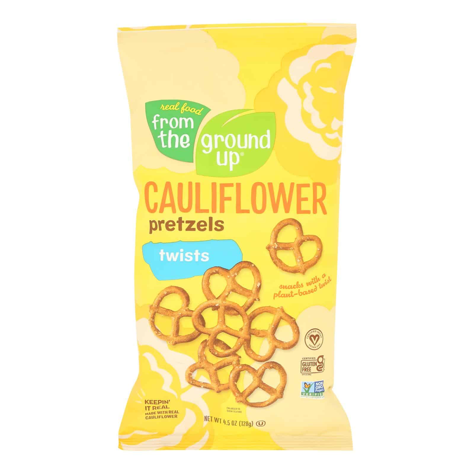 Made with real cauliflower. Explosion of flavor. Certified Gluten-free. Certified Vegan. vegan.org. Non GMO Project verified. nongmoproject.org. Real food from the ground up. Snacks with a Plant-based twist. Keepin’ it real. Calling all snack-lover and health-enthusiasts-don’t let the dehydrated veggie chips of the world tell you that less is more, that’s nonsense! More is more! That’s why we’re doing our all, so you can have it all – more veggies, more flavor, more crunch, more per serving. Pretzels about 20 per serving. Veggie packed goodness. vegan.org. nongmoproject.org. FromTheGroundUpSnacks.com. Facebook. Twitter. Instagram (at)FromTheGroundUpSnacks. Product of USA.