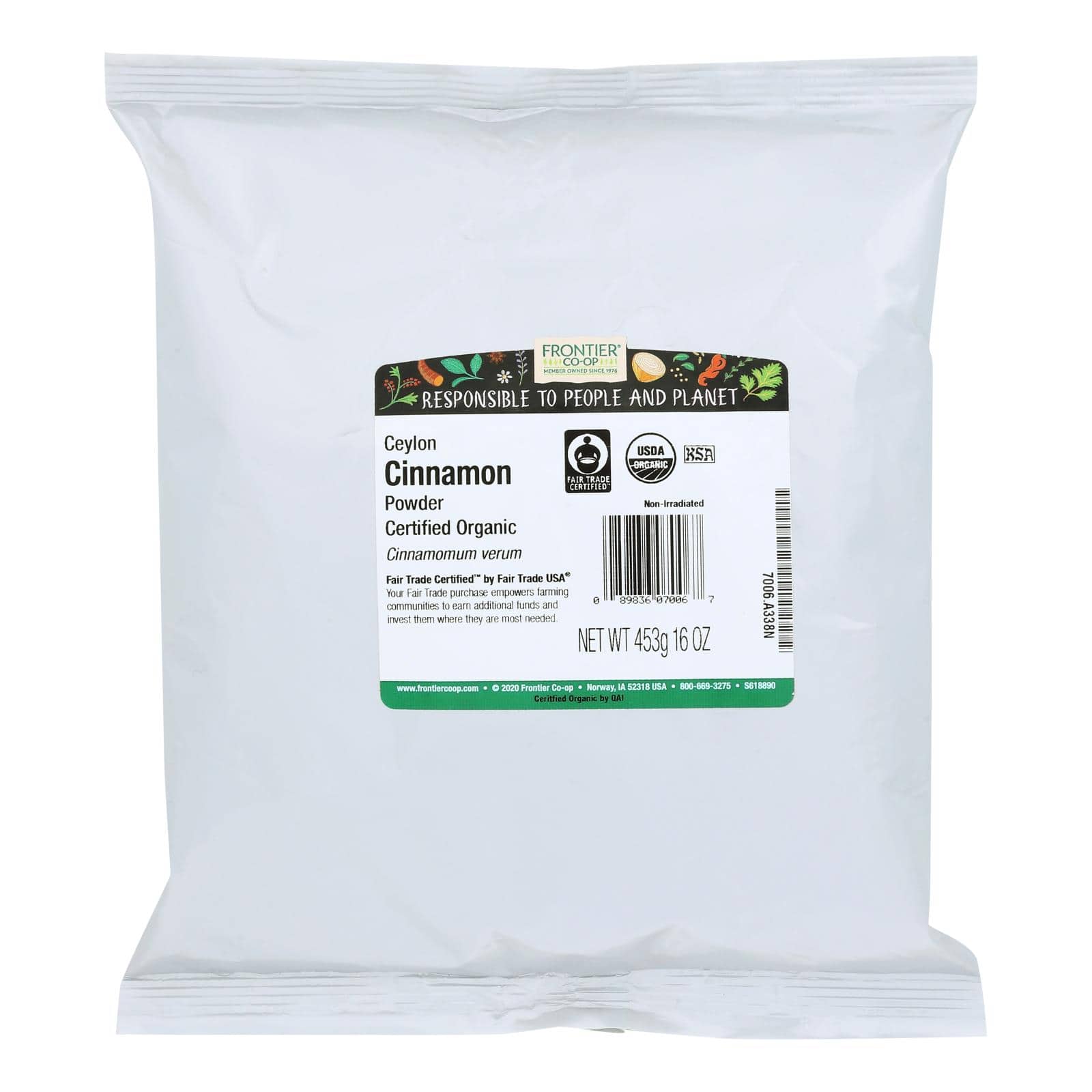 FRONTIER NATURAL PRODUCTS CO-OP FAIR TRADE POWDERED CEYLON CINNAMON FLAVORS YOUR STEWED AND CURRIED DISHES AS WELL AS LENDING ITS AROMATIC GOODNESS TO YOUR BAKING. YOU CAN FEEL GOOD ABOUT PURCHASING CINNAMON THAT SUPPORTS ENVIRONMENTAL STEWARDSHIP AND A FAIR WAGE FOR FARMING FAMILIES. OUR CINNAMON IS NON-IRRADIATED TO MAKE SURE YOU GET ALL THE GOODNESS OF THE NATURAL PRODUCT. EACH BAG CONTAINS 16 OZ. OF POWDERED CINNAMON.