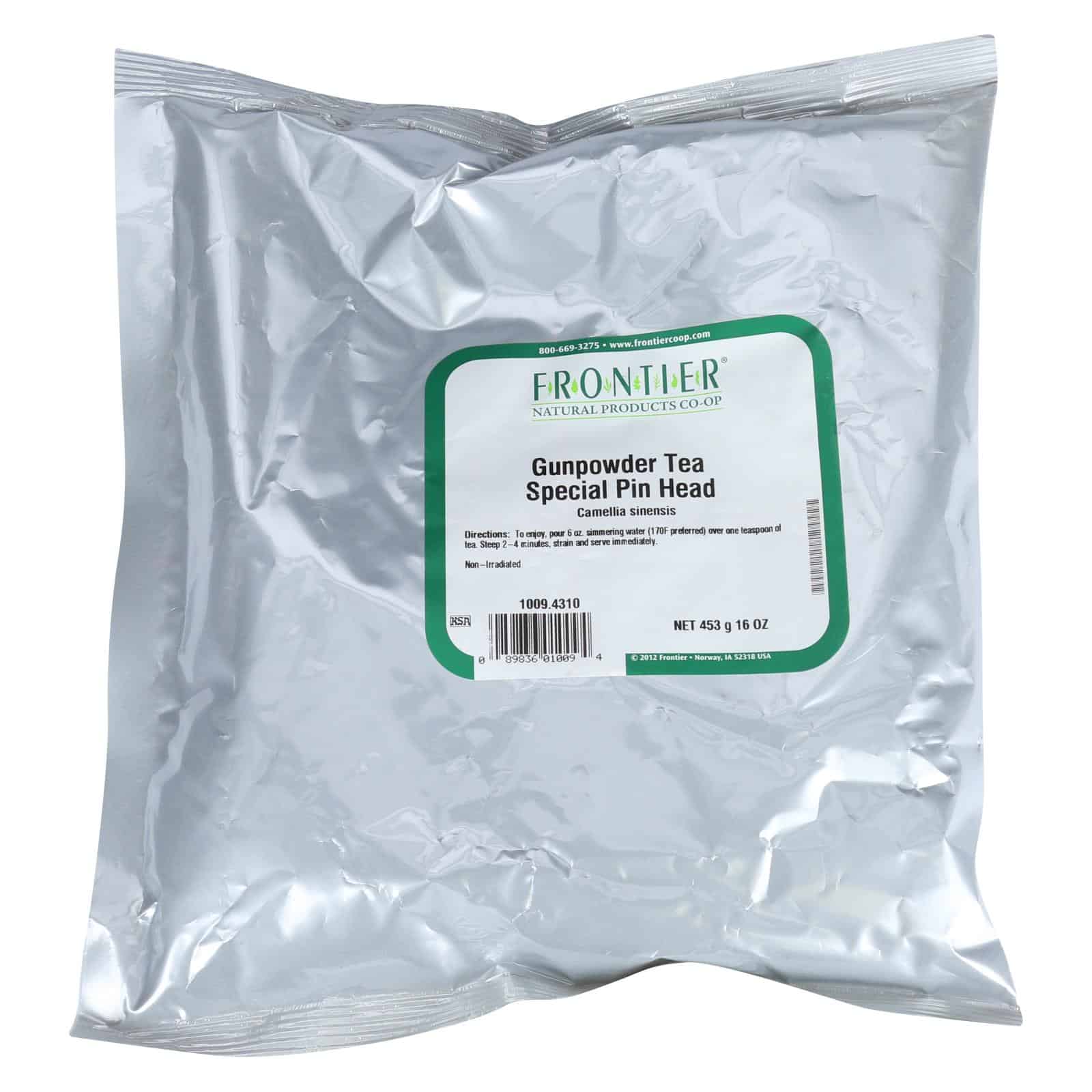 FRONTIER NATURAL PRODUCTS CO-OP GUNPOWDER TEA, SPECIAL PIN HEAD, IS A LIGHT-BODIED TEA WITH A SLIGHTLY SMOKY TANG THAT DELIGHTS YOUR TASTE BUDS. A GOOD SOURCE OF ENERGY-BOOSTING CAFFEINE, THIS ORGANIC AND NON-IRRADIATED TEA IS A HEALTHY BEVERAGE OPTION. OUR ORGANIC GUNPOWDER TEA COMES IN A 16 OZ. PACKAGE.