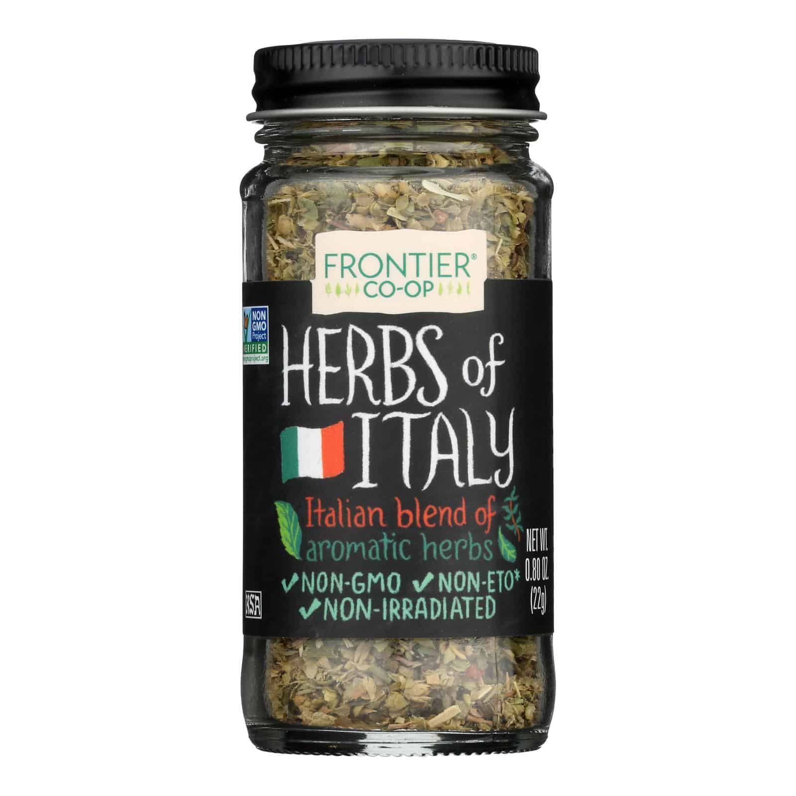 FRONTIER CO-OP HERBS OF ITALY, SEASONING BLEND IS NEVER TESTED ON ANIMALS. THIS PRODUCT IS A BLEND OF OREGANO, THYME, BASIL AND GARLIC MAKING FOR A GREAT COMBINATION FOR ADDED FLAVOR IN YOUR FAVORITE MAIN DISH RECIPES. FRONTIER CO-OP HERBS OF ITALY, SEASONING BLEND COMES PACKAGED WITH 0.8 OZ. OF PRODUCT FOR YOUR CONVENIENCE IN A RESEALABLE, GLASS JAR AND IS CERTIFIED USDA ORGANIC. THIS PRODUCT IS A DELICIOUS ADDITION TO APPETIZERS, SAUCES, AND DIPS. FRONTIER CO-OP IS COMMITTED TO QUALITY, SUSTAINABILITY, AND ETHICAL TRADE.