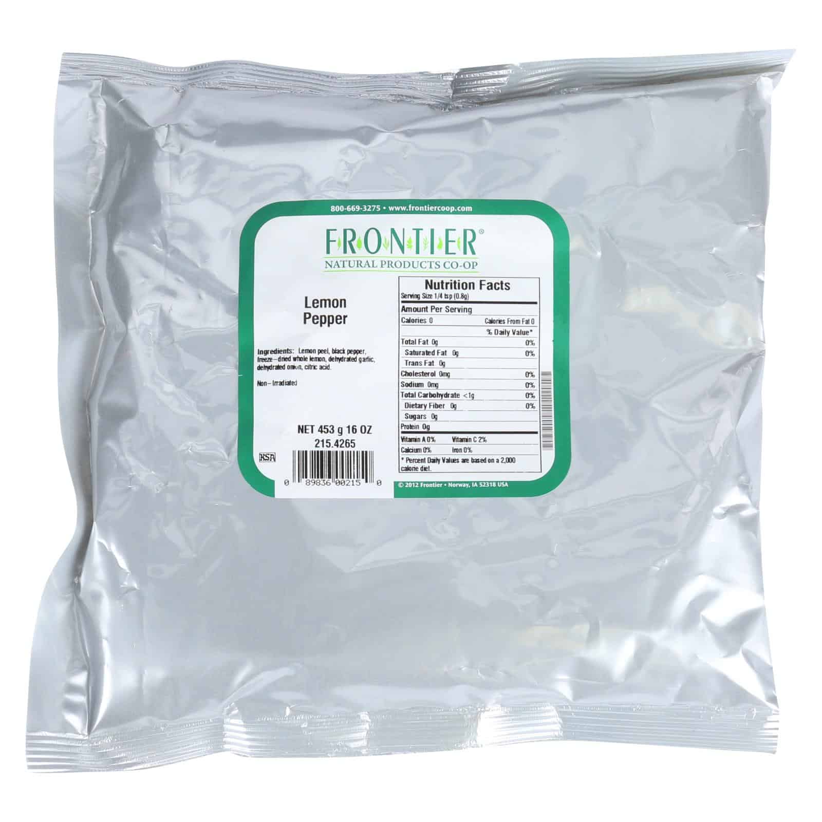FRONTIER NATURAL PRODUCTS CO-OP LEMON PEPPER GIVES YOU A BLEND OF TART LEMON FLAVORING AND SPICY PEPPER TO TOP ALL OF YOUR FAVORITE SAVORY DISHES. GENEROUSLY SPRINKLE THE SEASONING ON CHICKEN OR VEGGIES BEFORE ROASTING THEM ON THE GRILL, OR SHAKE THE LEMON PEPPER INTO A SALAD. EACH BAG CONTAINS 16 OZ. OF LEMON PEPPER SEASONING.