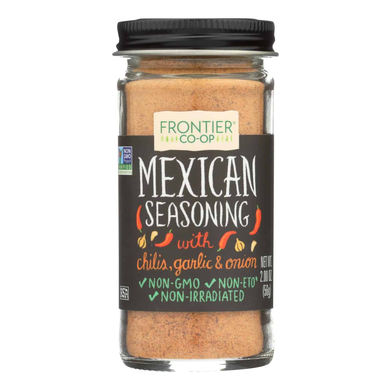 FRONTIER CO-OP MEXICAN SEASONING BLEND IS NEVER TESTED ON ANIMALS. THIS PRODUCT HAS A GREAT FLAVOR OF CHILIS, GARLIC AND ONION FOR YOUR NEXT TACO TUESDAY OR BURRITO NIGHT. FRONTIER CO-OP MEXICAN SEASONING BLEND COMES PACKAGED FOR YOUR CONVENIENCE IN AN EASY-TO-OPEN JAR AND CONTAINS 2 OZ. OF PRODUCT. THIS PRODUCT NON-GMO PROJECT VERIFIED AND CONSIDERED KOSHER.
