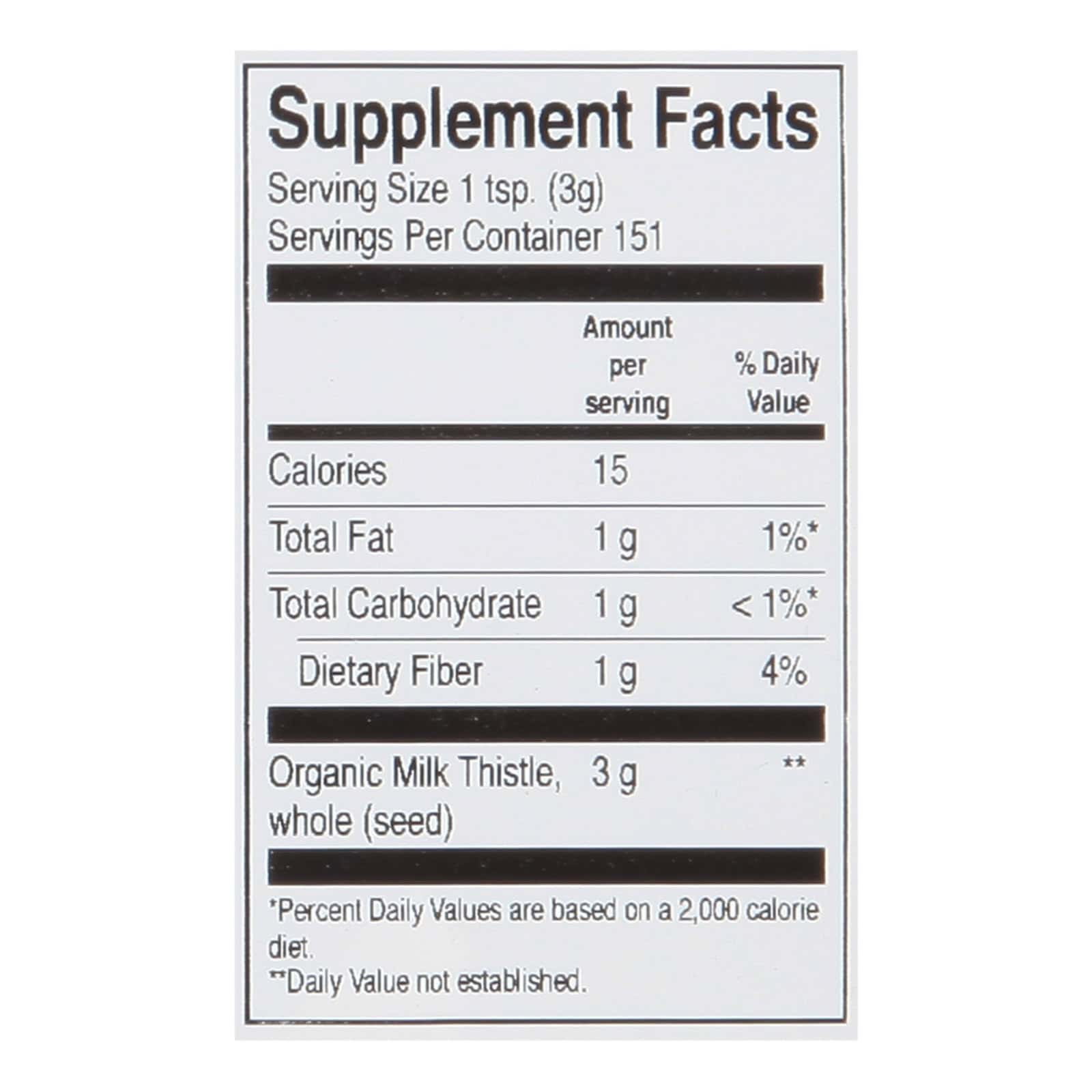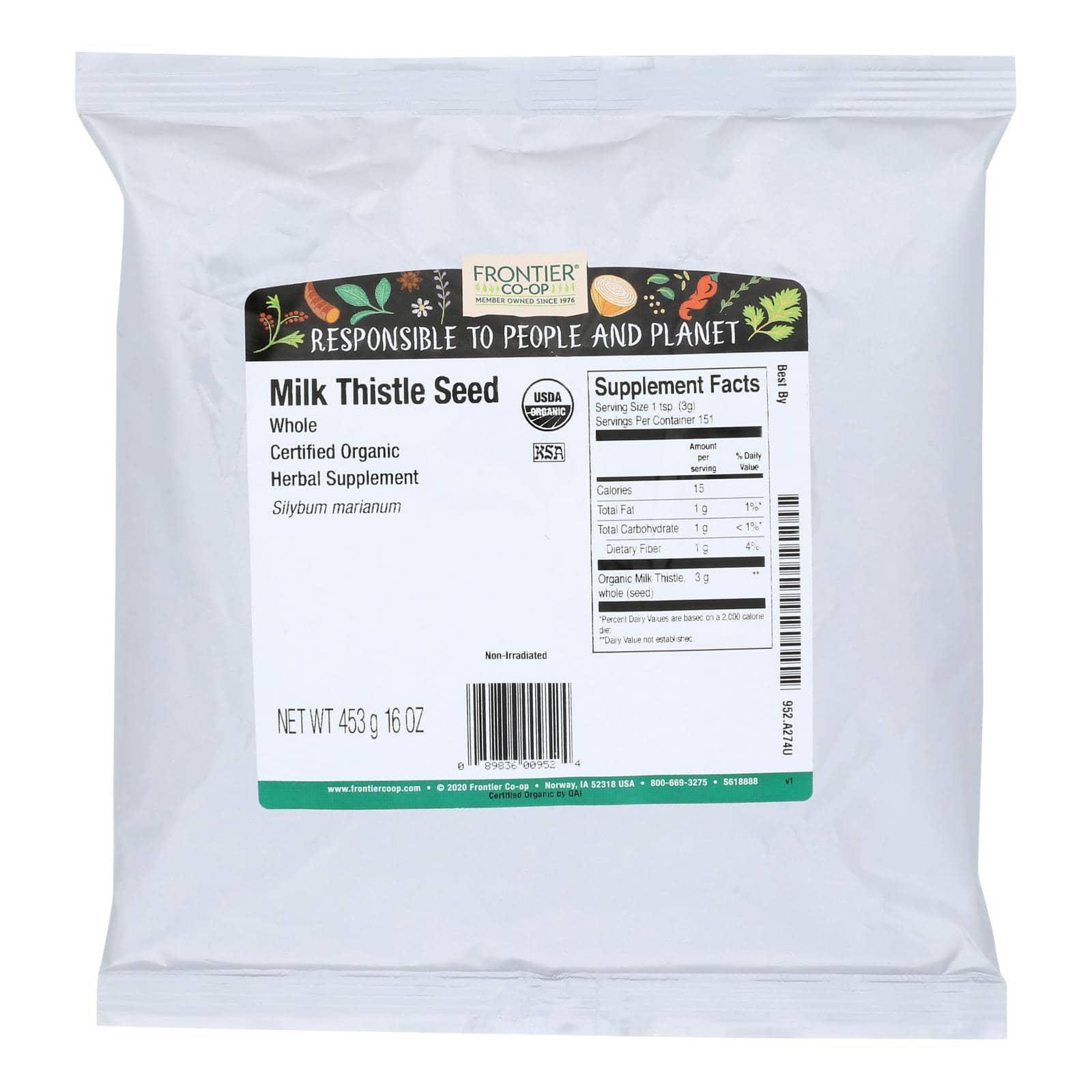 FRONTIER CO-OP ORGANIC WHOLE MILK THISTLE SEED HERBAL SUPPLEMENT IS EASY TO GRIND AND USE IN YOUR SEEDED RECIPES OR STEEP INTO A PUNGENT TEA OR TINCTURE. NON-IRRADIATED, THIS MILK THISTLE SEED RETAINS ITS FLAVOR AND POTENCY, AND IT’S CERTIFIED ORGANIC BY QAI AND THE USDA FOR RELIABLE QUALITY AND YOUR PEACE OF MIND. THIS SEED COMES IN A 16 OZ. BAG TO HELP YOU KEEP YOUR PANTRY WELL STOCKED.