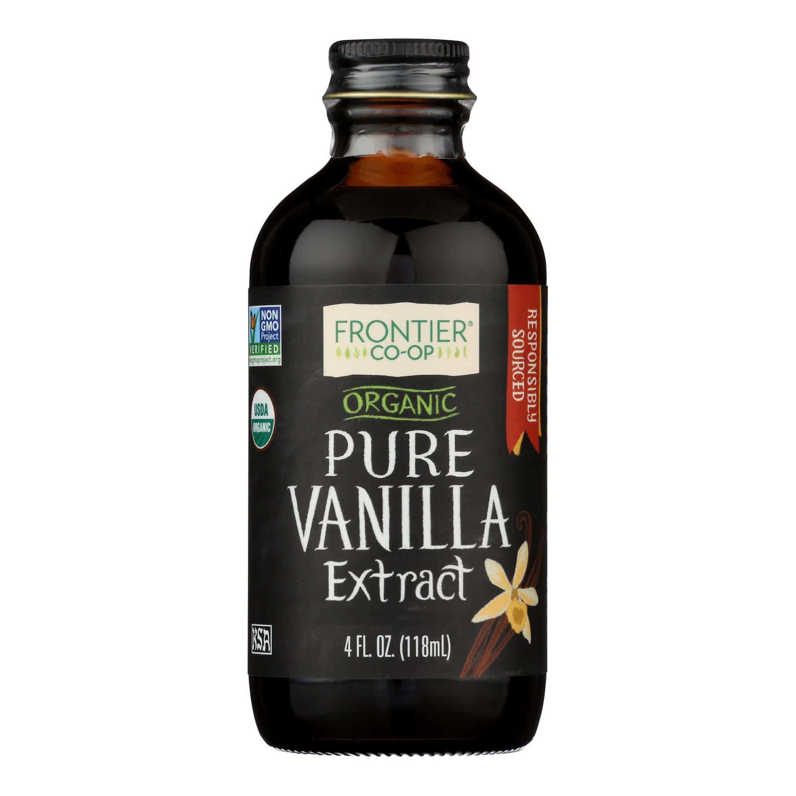 FRONTIER CO-OP VANILLA EXTRACT IS NEVER TESTED ON ANIMALS. THIS PRODUCT IS MADE FROM GOURMET BOURBON BEANS AND HAS A FULL, RICH FLAVOR THAT PAIRS WELL IN ALMOST EVERY KIND OF DESSERT THAT YOU CAN IMAGINE. FRONTIER CO-OP VANILLA EXTRACT COMES PACKAGED FOR YOUR CONVENIENCE IN AN EASY-TO-OPEN BOTTLE AND CONTAINS 4 FL. OZ. OF PRODUCT. THIS PRODUCT IS CERTIFIED USDA ORGANIC AND IS CONSIDERED KOSHER. FRONTIER CO-OP IS COMMITTED TO QUALITY, SUSTAINABILITY, AND ETHICAL TRADE.