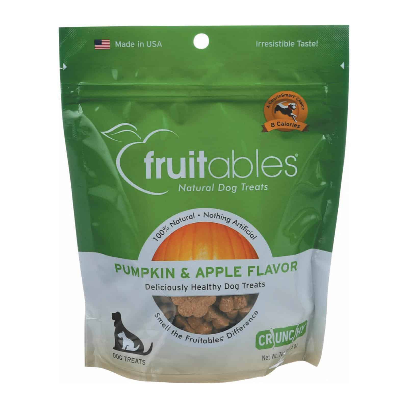 FRUITABLES DOG TREATS PUMPKIN APPLE RECIPE FEATURES FRESH PUMPKIN, SWEET APPLES, OATMEAL, BARLEY, POTATOES AND A TOUCH OF CINNAMON. EVERY 7 OZ. BAG OF FRUITABLES DOG TREATS IS FREE OF CORN, SOY AND WHEAT, AND WE DON?T ADD ANY ARTIFICIAL INGREDIENTS, COLORS OR PRESERVATIVES. CRUNCHY, HEALTHY AND DELICIOUS, FRUITABLES DOG TREATS ARE MADE IN THE U.S.A. SEE NUTRITION FACTS PANEL FOR ALLERGENS.