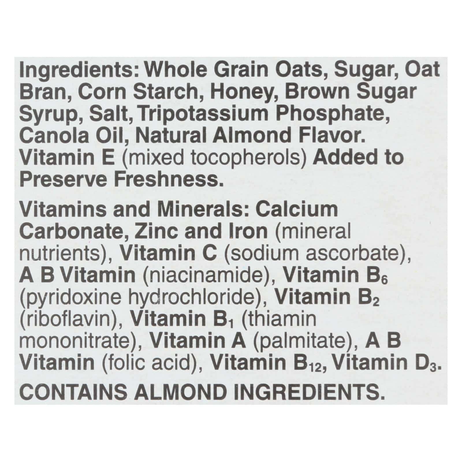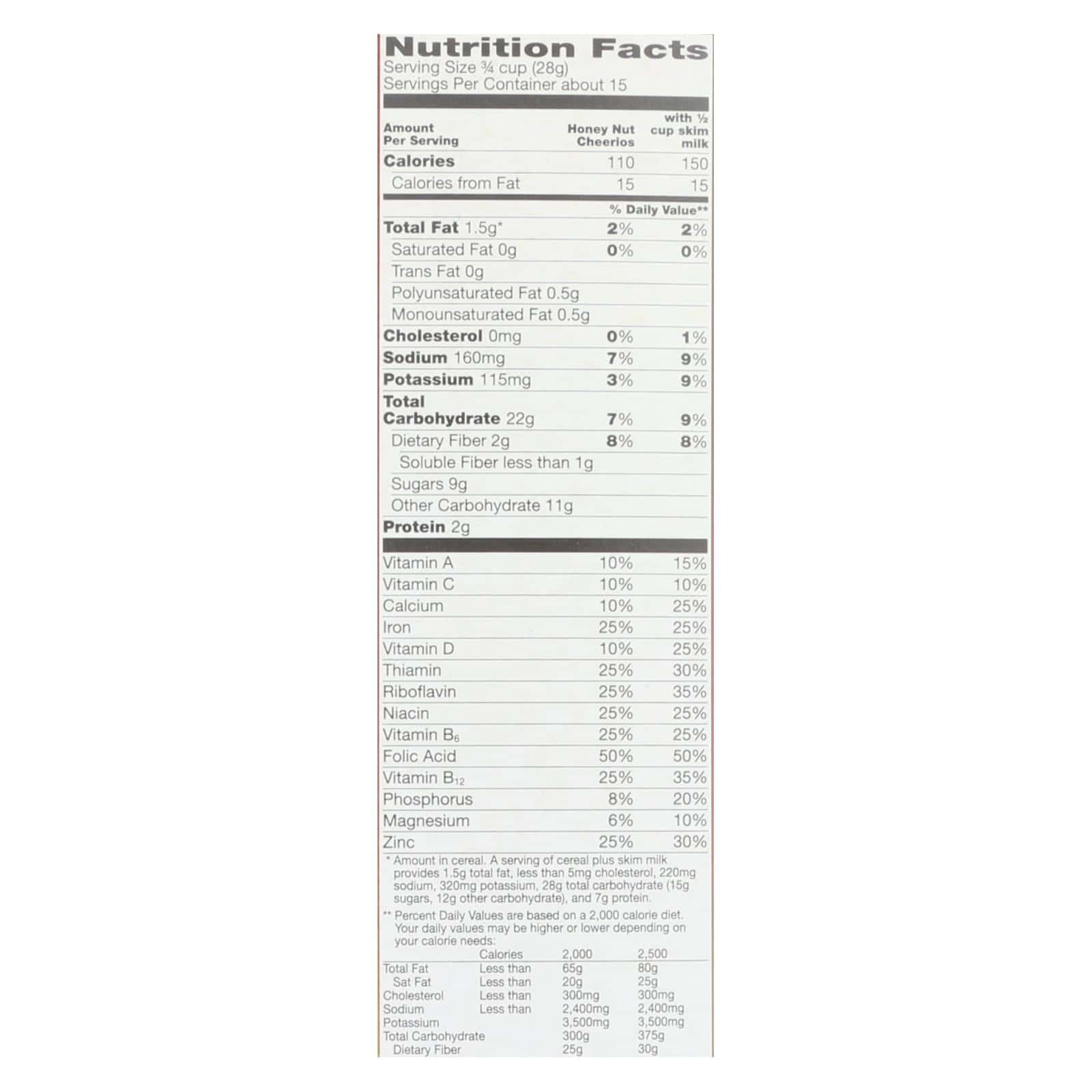 Sweetened whole grain oat cereal with real honey & natural almond flavor. Naturally flavored. Per 1 Cup Serving: 140 calories; 0 g sat fat (0% DV); 210 mg sodium (9% DV); 12 g total sugars. See nutrition facts for as prepared information. 22 g whole grain per serving. At least 48 g recommended daily. Gluten free. Can help lower cholesterol (three grams of soluble fiber daily from whole grain oat foods, like Honey Nut Cheerios Cereal, in a diet low in saturated fat and cholesterol, may reduce the risk of heart disease. Honey nut cheerios cereal provides 0.75 grams per serving) as part of a heart healthy diet. Contains bioengineered food ingredients. Learn more at ask.generalmills.com. First ingredient whole grain oats. Made with real honey. Amazing taste starts here. A Buzz-worthy choice! Real honey, a-maze-ing taste! Thanks to Buzz and his real honey goodness, you can get this day started right with delicious and nutritious. Now that’s a good morning. Give yourself a high-five! Or maybe just another bowl. This package is sold by weight, not by volume. You can be assured of proper weight even though some settling of contents normally occurs during shipment and handling. A whole grain food is made by using all three parts of the grain. celiac.org. ask.generalmills.com. generalmills.com. how2recycle.info. btfe.com. We welcome your questions and comments: generalmills.com. 1-800-328-1144. Proud sponsor of Celiac Disease Foundation. celiac.org. Box Tops for Education: No more clipping. Scan your receipt. See now at btfe.com. 100% recycled paperboard. how2recycle.info.
