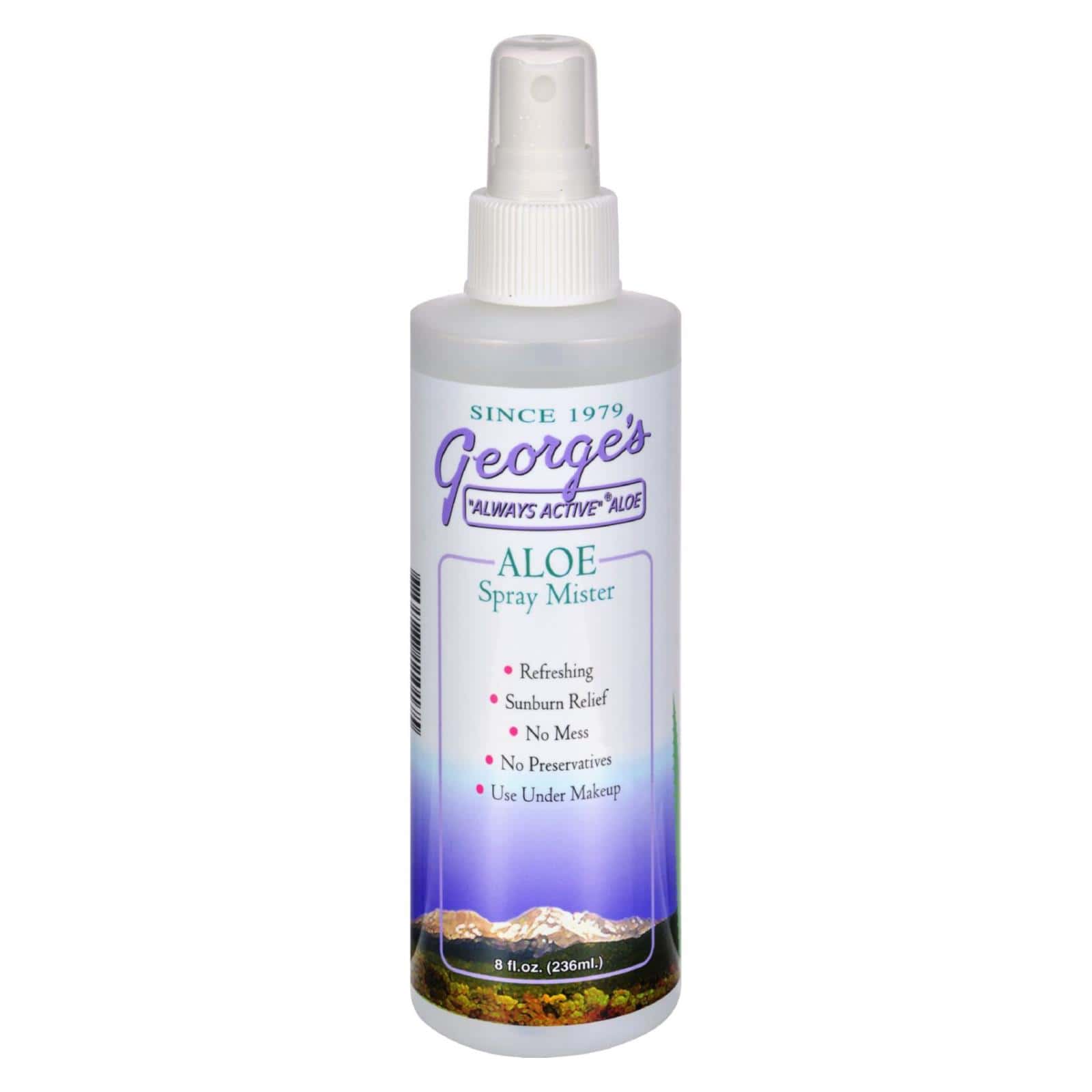 George’s Always Active Aloe Spray Mister Description: Refreshing Sunburn Relief No Mess No Preservatives Use Under Makeup A cooling refreshing spray. Free Of Preservatives. Disclaimer These statements have not been evaluated by the FDA. These products are not intended to diagnose, treat, cure, or prevent any disease.
