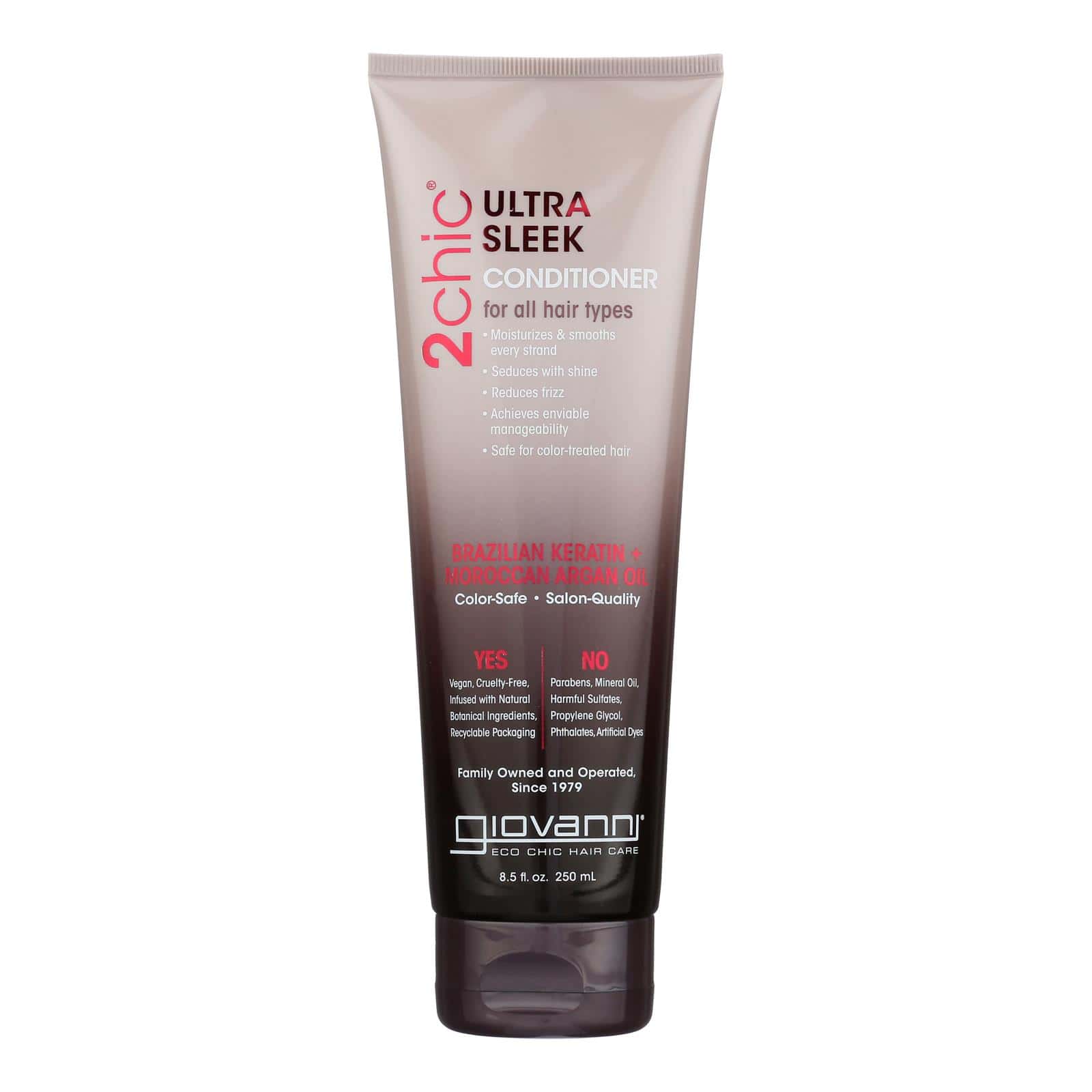 GIOVANNI, CONDITIONER 2CHIC ULTRA-SLEEK CONDITIONER WITH BRAZILIAN KERATIN & ARGAN OIL IS A PRODUCT YOU CAN COUNT ON. IT IS MADE WITHOUT ANY TESTING ON ANIMALS. IT IS ORGANIC AND VEGETARIAN. FORMULATED FOR ALL HAIR TYPES, IT DOESN’T CONTAIN ANY DYES, PARABENS OR OTHER HARMFUL CHEMICALS, INCLUDING PEGS. THE RICH POWER OF KERATIN AND ARGAN OIL WILL BANISH FRIZZ AND SMOOTH EVERY STRAND. EACH BOTTLE CONTAINS 8.5 FL. OZ. OF CONDITIONER.