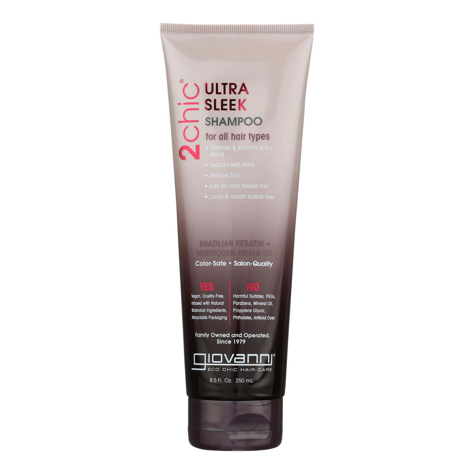GIOVANNI, SHAMPOO 2CHIC ULTRA-SLEEK SHAMPOO WITH BRAZILIAN KERATIN & ARGAN OIL IS A PRODUCT YOU CAN COUNT ON. IT IS MADE WITHOUT ANY TESTING ON ANIMALS. IT IS ORGANIC AND VEGETARIAN. FORMULATED FOR ALL HAIR TYPES, THIS SHAMPOO WILL SMOOTH EVERY STRAND AND BANISH FRIZZ. IT DOESN’T CONTAIN ANY DYES, PARABENS OR OTHER HARMFUL CHEMICALS, INCLUDING PEGS. EACH BOTTLE CONTAINS 8.5 FL. OZ. OF SHAMPOO.