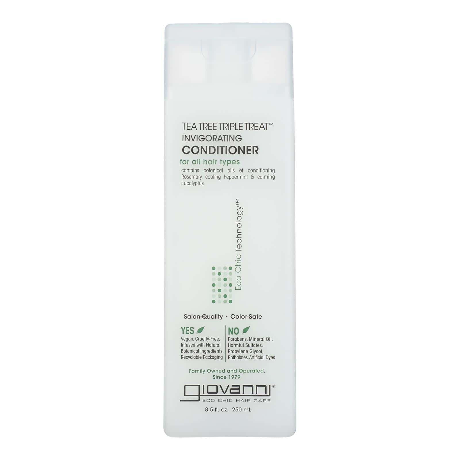 GIOVANNI, CONDITIONER TEA TREE TRIPLE TREAT CONDITIONER IS A PRODUCT YOU CAN COUNT ON. IT IS MADE WITHOUT ANY TESTING ON ANIMALS. IT IS ORGANIC AND VEGETARIAN. FORMULATED FOR ALL HAIR TYPES, IT DOESN’T CONTAIN ANY DYES, PARABENS OR OTHER HARMFUL CHEMICALS, INCLUDING PEGS. THIS CONDITIONER HAS BOTANICAL OILS OF ROSEMARY, COOLING PEPPERMINT AND CALMING EUCALYPTUS. EACH BOTTLE CONTAINS 8.5 FL. OZ. OF CONDITIONER.
