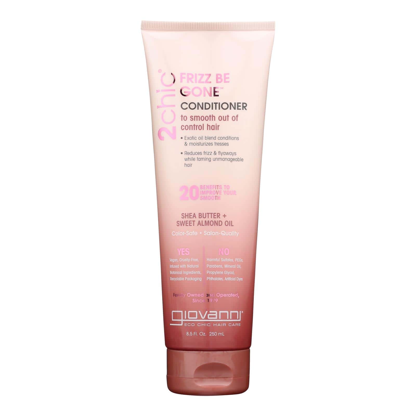 GIOVANNI 2CHIC FRIZZ BE GONE CONDITIONER RESTORES VIBRANCY TO YOUR HAIR. TREAT YOURSELF TO A RELAXING SPA EXPERIENCE IN YOUR OWN SHOWER, SOFTENING YOUR TRESSES WHILE SEALING IN MOISTURE. 100% VEGETARIAN INGREDIENTS WITH NO ADDED PARABENS, SLS OR SLES. CONTAINS ONE 8.5 OZ. BOTTLE OF CONDITIONER. AT GIOVANNI, WE ERASE THE LINES BETWEEN NATURAL AND PROFESSIONAL HAIR CARE AND OFFER THE CONSUMER COMPLETE HAIR CARE SOLUTIONS. WE OFFER A PLETHORA OF GEL, MOUSE, HAIR SPRAY, LEAVE-IN CONDITIONERS, VITAMIN HAIR TREATMENTS AND HAIR RE-CONSTRUCTORS TO ALLOW YOU TO ACHIEVE YOUR UNIQUE LOOK AND STYLE.