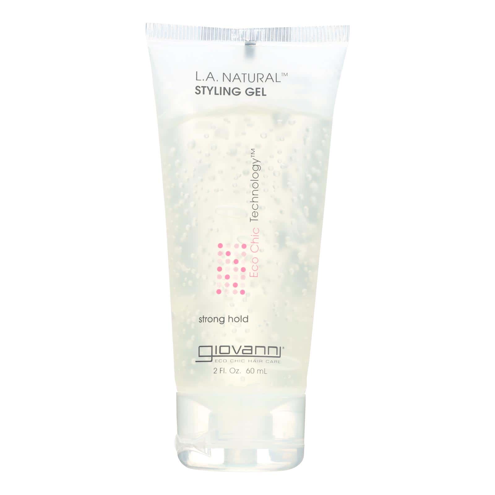 GIOVANNI, STYLING GEL L.A. NATURAL STYLING GEL IS AN ORGANIC, STELLAR PRODUCT YOU CAN COUNT ON. IT IS MADE WITHOUT ANY TESTING ON ANIMALS, AND IS VEGETARIAN. IT DOESN’T CONTAIN ANY DYES, PARABENS OR OTHER HARMFUL CHEMICALS, INCLUDING PEGS. THIS IS A UNIQUE COMBINATION OF CERTIFIED ORGANIC BOTANICALS THAT HAS EXTREME HOLDING POWER INFUSED WITH SURFACE ENHANCERS FOR BRILLIANT SHINE. EACH BOTTLE CONTAINS 2 FL. OZ. OF HAIR SPRAY.