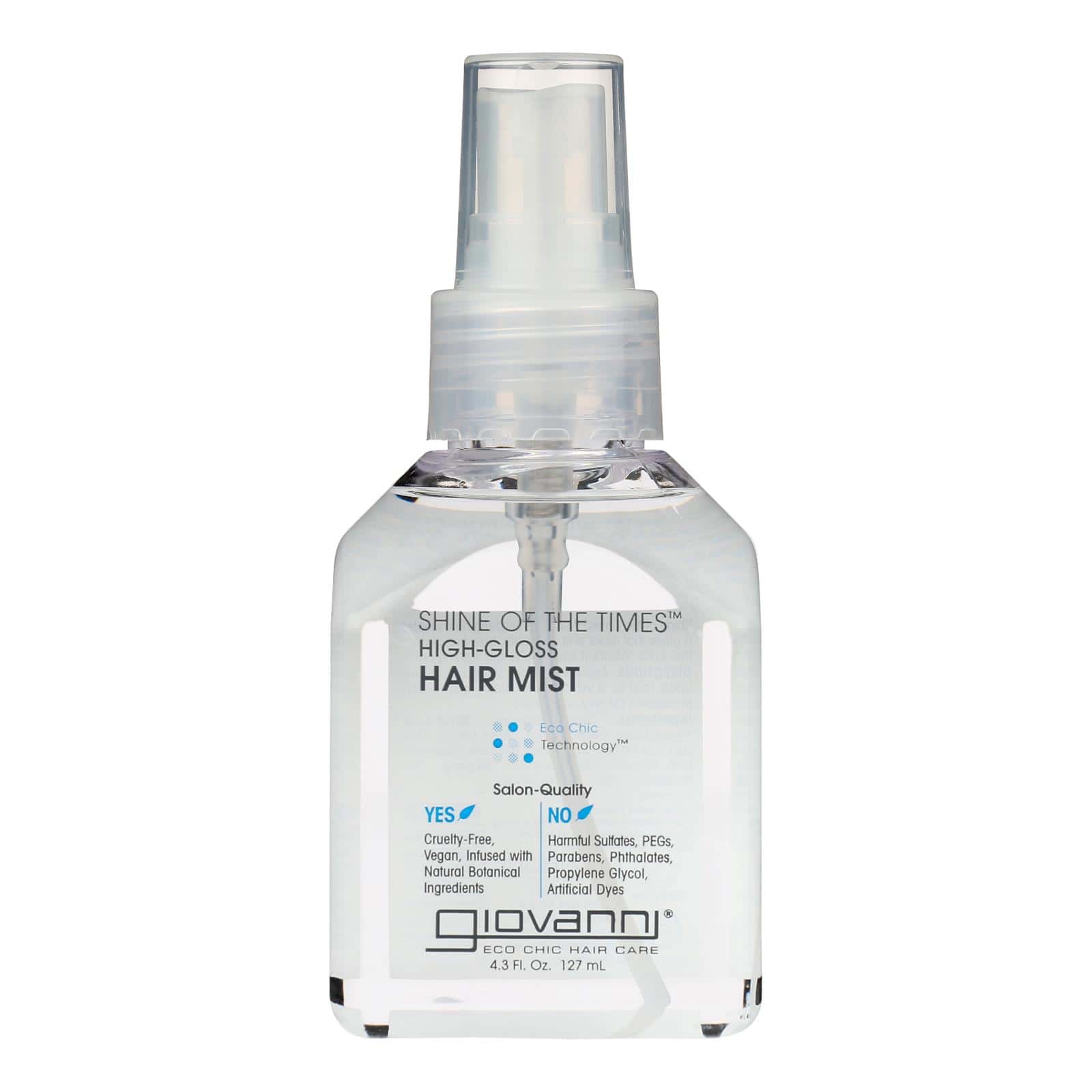 GIOVANNI, STYLING SHINE OF THE TIMES IS A 100% VEGETARIAN HIGH GLOSS HAIR MIST, A FINISHING MIST THAT CREATES A BEAUTIFUL GLOSS. APPLY SHINE OF THE TIMES TO YOUR FINISHED STYLE BY WALKING UNDER MIST FOR A VEIL OF SHINE. BRUSH AND REAPPLY AS NEEDED THROUGHOUT THE DAY. SHINE OF THE TIMES HAS CALIFORNIA POPPY, ROSEMARY AND WILD BERGAMOT. EACH BOTTLE HAS 4.3 FL. OZ. OF MIST.