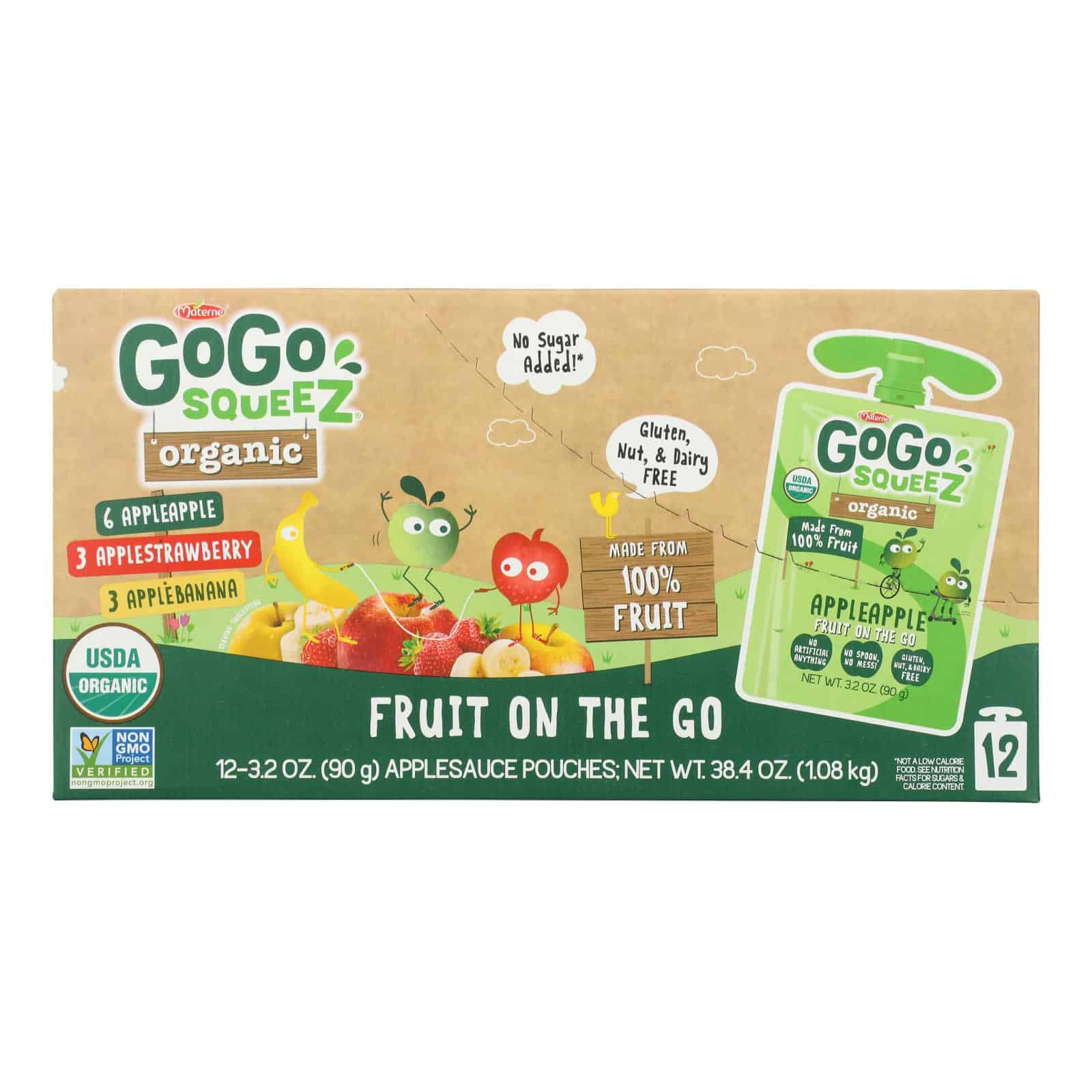 GOGO SQUEEZ ORGANIC APPLESAUCE ON THE GO INCLUDES THREE GREAT FLAVORS OF APPLESAUCE THAT ARE GREAT FOR KIDS TO EAT ANYWHERE THEY GO. THIS VARIETY PACK INCLUDES APPLE, STRAWBERRY AND BANANA APPLESAUCE POUCHES THAT ARE ALL USDA ORGANIC, NON-GMO AND GLUTEN, NUT AND DAIRY FREE. THESE POUCHES TAKE THE MESS OUT OF HEALTHY EATING. SEE NUTRITION FACTS PANEL FOR ALLERGENS. INCLUDES TWELVE 3.2 OZ. POUCHES OF GOGO SQUEEZ APPLESAUCE POUCHES. AT GOGO SQUEEZ, OUR MISSION IS TO MAKE IT EASIER FOR KIDS AND FAMILIES TO BE A LITTLE HEALTHIER AND HAPPIER EVERY DAY. SQUEEZE A LITTLE GOODNESS INTO YOUR DAY.
