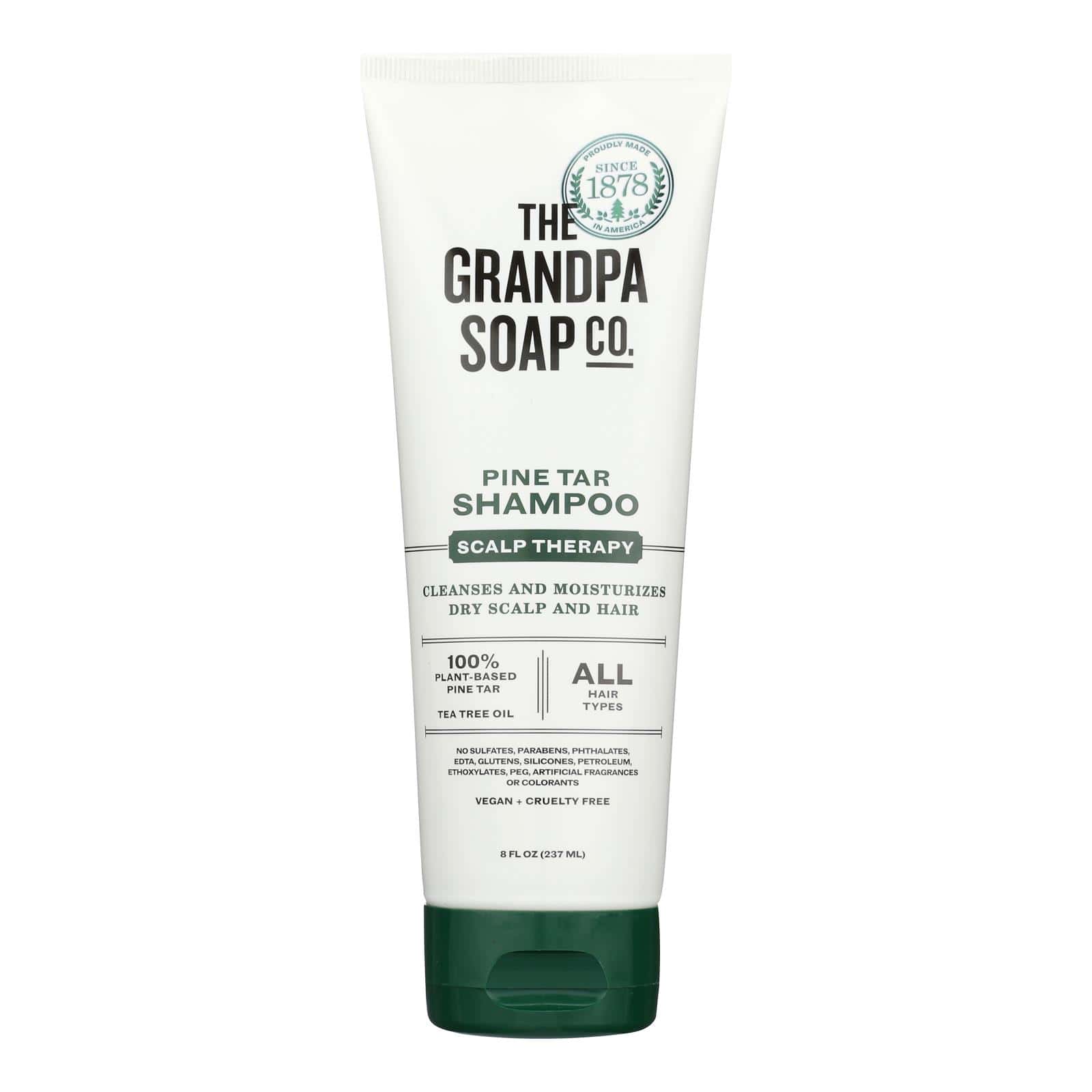 THE GRANDPA SOAP COMPANY SHAMPOO, PINE TAR IS FOR ALL HAIR TYPES. THIS PRODUCT IS MADE FROM 100% PLANT-BASED PINE TAR AND TEA TREE OIL. THE GRANDPA SOAP COMPANY SHAMPOO WORKS TO DEEP CLEAN AND MOISTURIZE DRY, ITCHY SCALP WITH THE POWER OF PINE TAR AND THE NATURAL PROPERTIES OF TEA TREE OIL. THIS PRODUCT COMES PACKAGED FOR YOUR CONVENIENCE AND CONTAINS 8 FL. OZ. OF SHAMPOO.