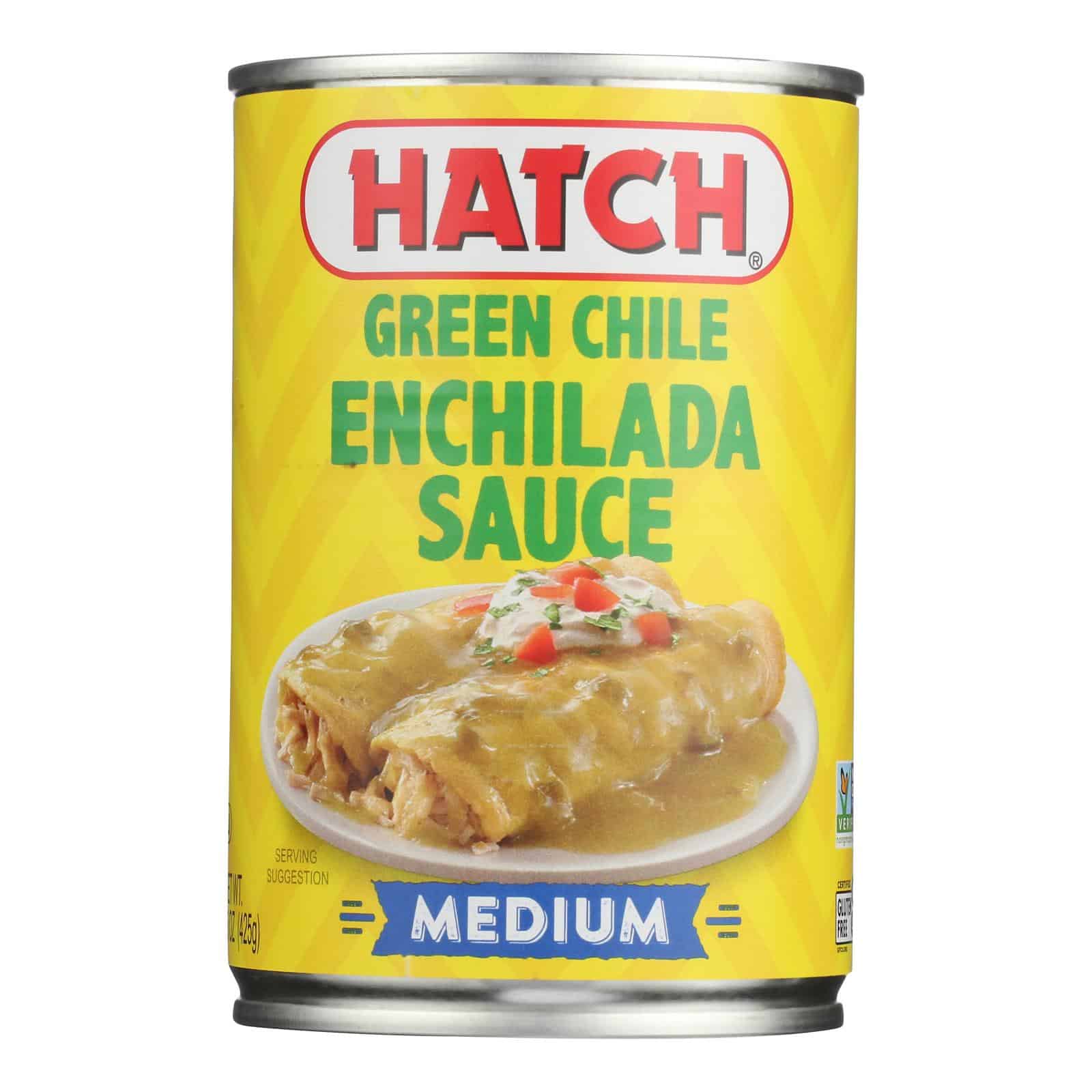 HATCH ENCHILADA SAUCE, GREEN CHILE MEDIUM IS A CONVENIENT PRODUCT IN A SEALED CAN THAT WILL PRESERVE THE CONTENTS FOR A LONG TIME. YOU’LL WANT TO KEEP THIS GREEN CHILE SAUCE IN YOUR PANTRY FOR MANY RECIPES AND OCCASIONS. IT IS A PERFECT ADDITION TO SPICY MEXICAN DISHES OR LIVENING UP CASSEROLES. EACH CAN CONTAINS 15 OZ. OF VERSATILE GLUTEN-FREE, KOSHER, NON-GMO AND VEGAN GREEN CHILE SAUCE.