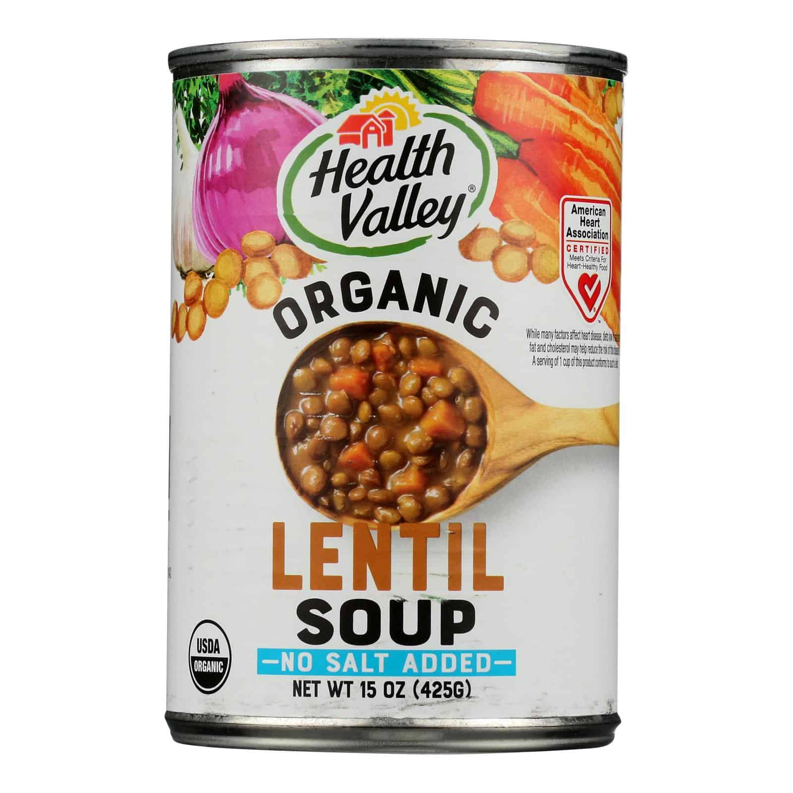 HEALTH VALLEY SOUP, ORGANIC LENTIL NO SALT IS A NATURAL AND DELICIOUS MEAL OPTION. MADE WITH NATURAL INGREDIENTS, THIS SOUP IS FREE OF UNNATURAL AND UNNECESSARY ADDITIVES. THIS PRODUCT IS MADE WITH NO ADDED SALT AND IS ORGANIC AND HEART HEALTHY. EACH CAN OF HEALTH VALLEY SOUP, ORGANIC LENTIL NO SALT CONTAINS 15 OZ. OF SOUP WITH TWO SERVINGS PER CAN AND 140 CALORIES PER SERVING.