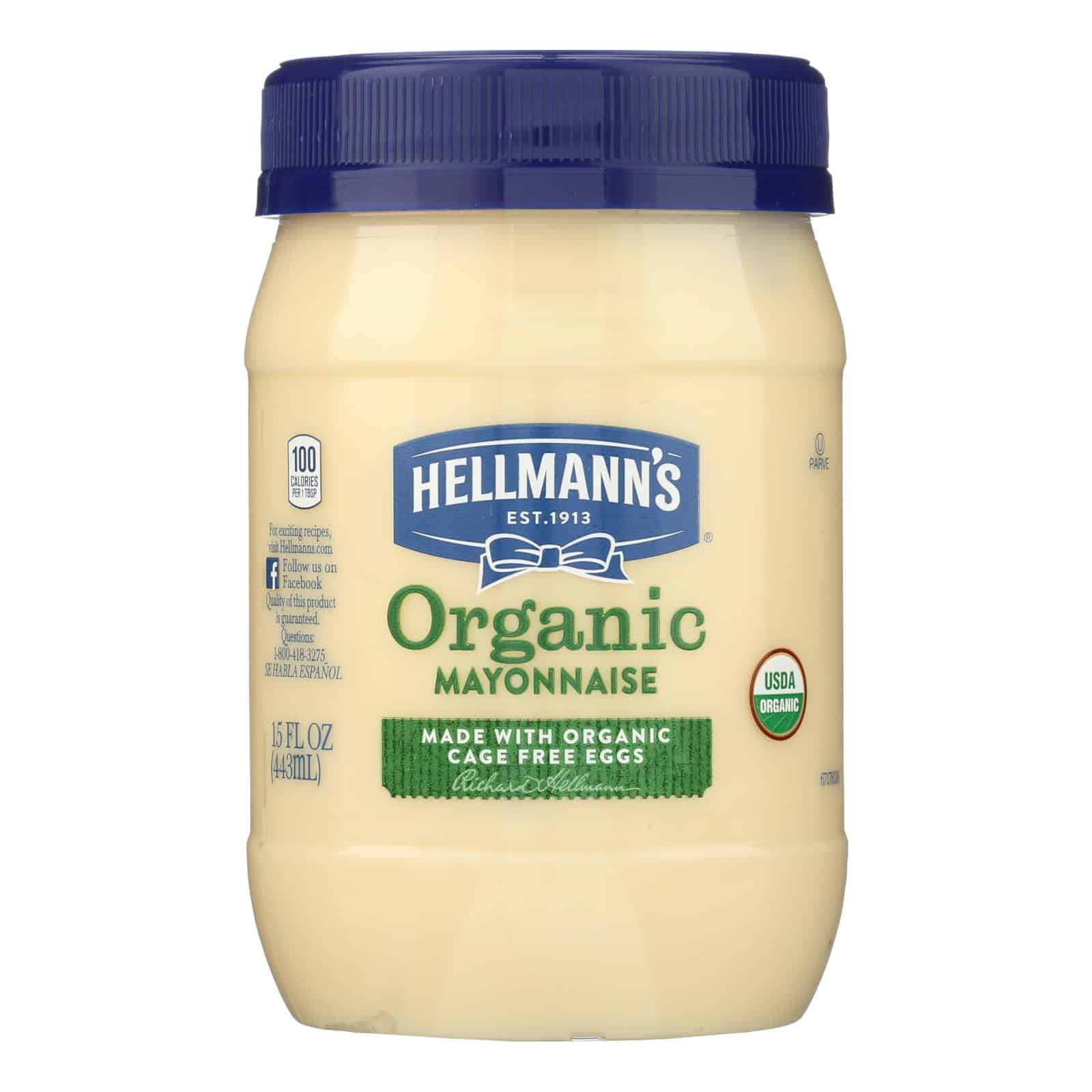 HELLMAN’S ORGANIC MAYONNAISE IS A CREAMY CONDIMENT MADE FROM CAGE-FREE EGGS, SOYBEAN OIL, VINEGAR AND A DASH OF LEMON JUICE CONCENTRATE FOR CITRUSY NOTES. SPREAD THIS GLUTEN-FREE MAYONNAISE ON SANDWICH BREAD TO COMPLEMENT YOUR FAVORITE FILLINGS, OR STIR A FEW SPOONFULS INTO POTATO OR EGG SALAD. OUR MAYONNAISE IS ALSO A GREAT STARTER FOR DIPS, SALAD DRESSINGS AND SAUCES. WE MAKE THIS DELICIOUS MAYONNAISE WITHOUT ARTIFICIAL FLAVORS OR PRESERVATIVES. THIS 15 FL. OZ. JAR PROVIDES 30 SERVINGS.