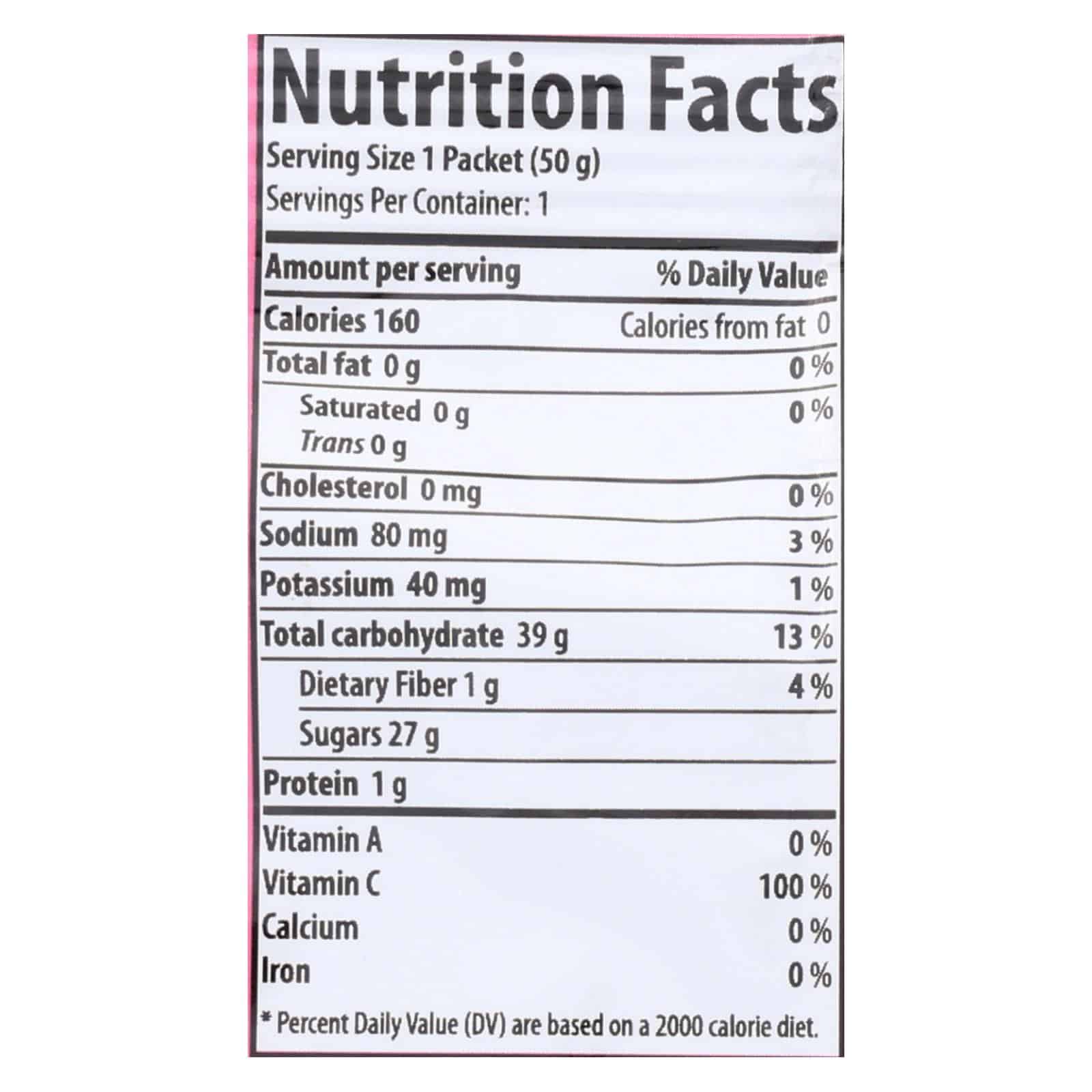 HONEY STINGER ENERGY CHEW IN PINK LEMONADE PROVIDES 100% OF THE DAILY VALUE OF VITAMIN C BASED ON A 2,000 CALORIE DIET. THIS PRODUCT HAS BEEN USDA-CERTIFIED ORGANIC BEING 95 TO 99 PERCENT ORGANIC. IT IS GLUTEN-FREE AND CONTAINS NO DAIRY. EACH 50 G. PACKET CONTAINS 60 MG. OF VITAMIN C AND 39 G. OF CARBOHYDRATES.