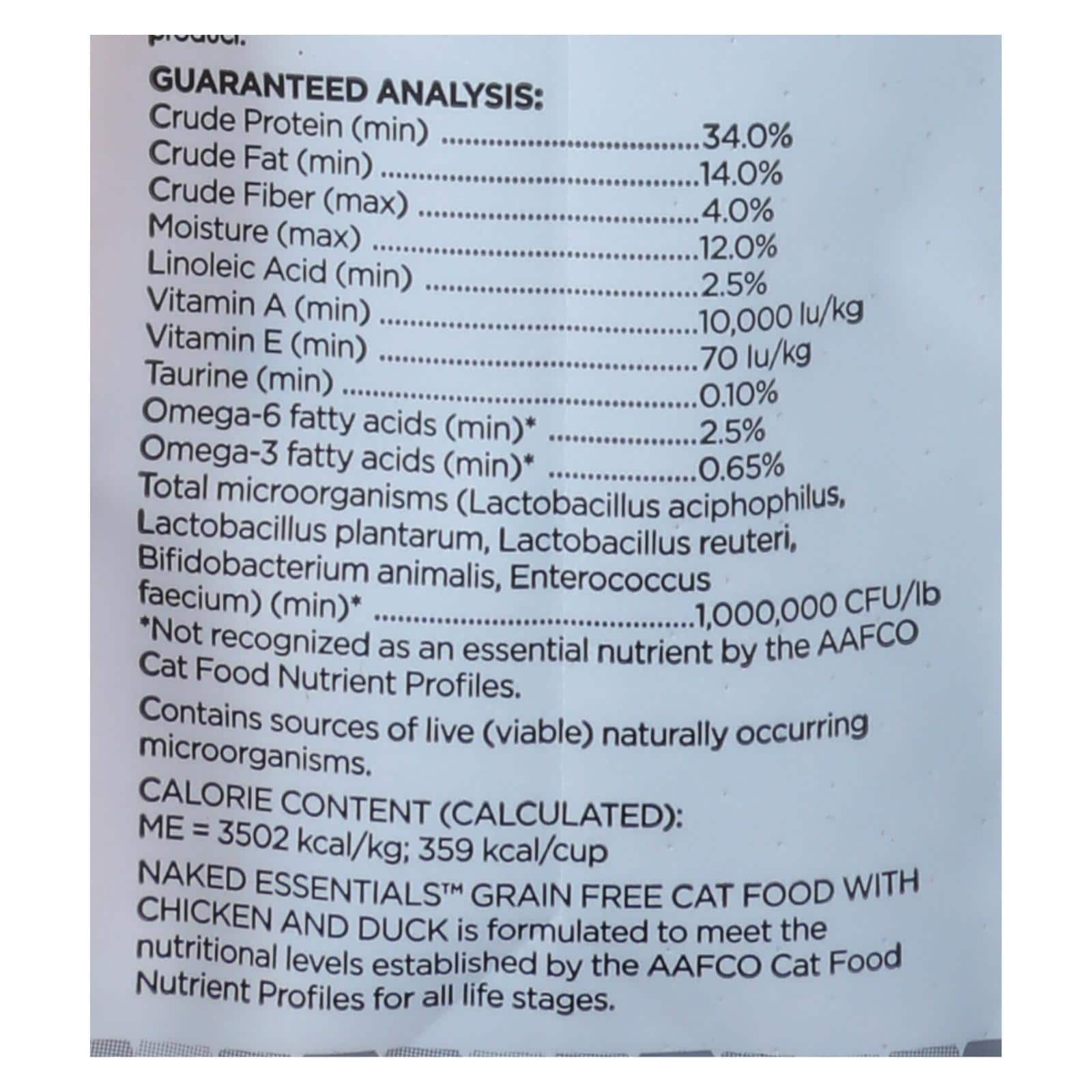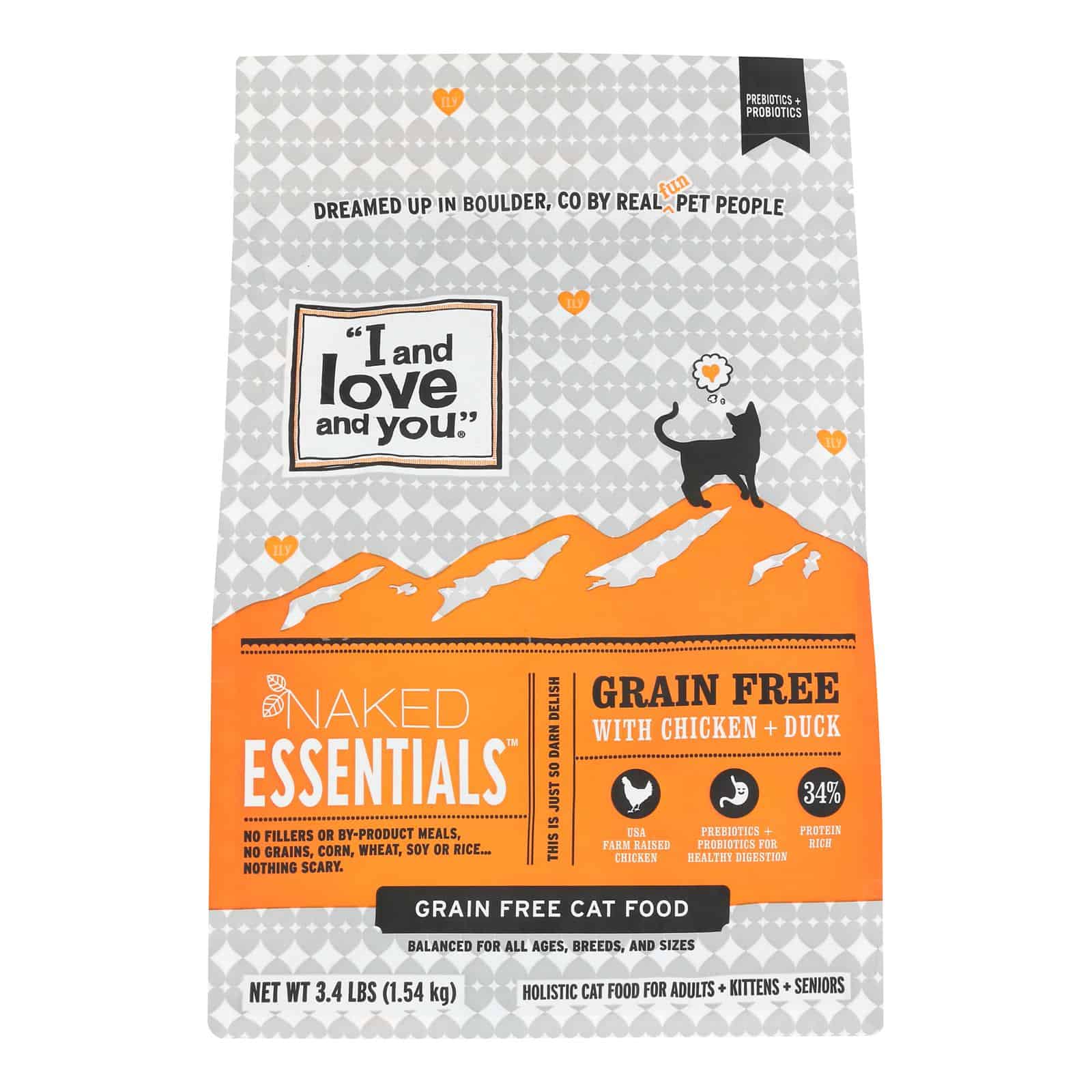 I AND LOVE AND YOU CAT DRY FOOD, NAKED ESSENTIALS WITH CHICKEN AND DUCK IS MADE WITH BALANCED INGREDIENTS FOR WHOLE PET HEALTH. PROBIOTICS AND PREBIOTICS SUPPORT HEALTHY DIGESTION WHILE OMEGAS 3 AND 6 SUPPORT HEALTHY SKIN AND COAT. MADE FOR ALL LIFE STAGES, THIS CAT FOOD IS FREE FROM FILLERS AND ARTIFICIAL COLORS, FLAVORS AND PRESERVATIVES. EACH BAG OF I AND LOVE AND YOU CAT DRY FOOD, NAKED ESSENTIALS CONTAINS 3.4 LBS. OF PRODUCT.