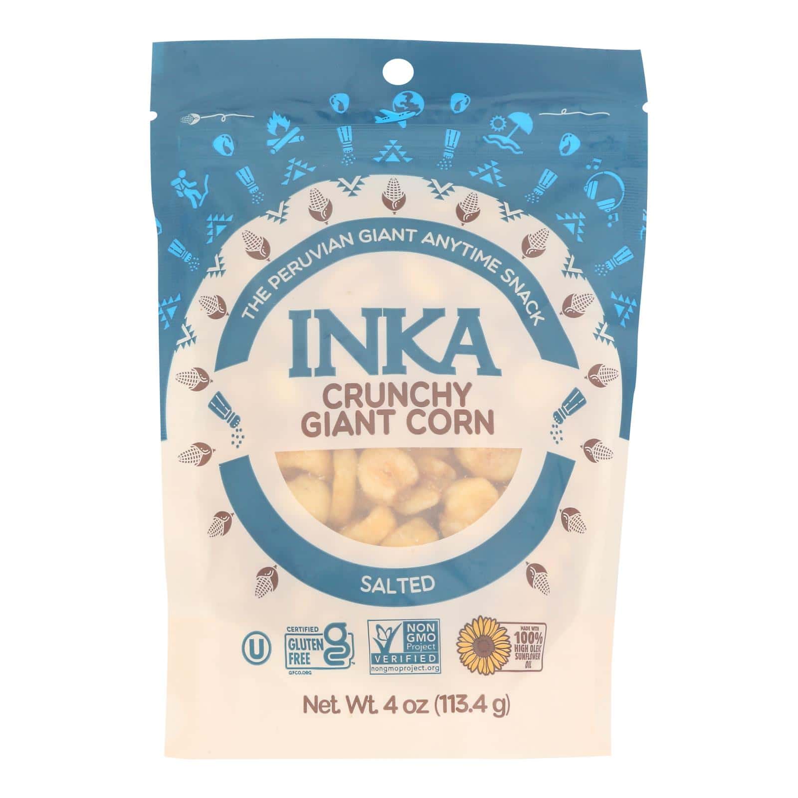 INKA CROPS ORIGINAL GIANT ROASTED CORN IS A UNIQUE AND HEALTHY SNACK. MADE WITH A MINIMAL AMOUNT OF NATURAL INGREDIENTS, INKA CROPS ORIGINAL GIANT ROASTED CORN IS A GREAT CHOICE FOR A NATURAL, ON-THE-GO SNACK. BECAUSE IT DOES NOT RELY ON UNNATURAL OR UNNECESSARY ADDITIVES OR INGREDIENTS, TO ACHIEVE ITS RICH AND TOASTY FLAVOR, INKA CROPS ORIGINAL GIANT ROASTED CORN OFFERS AN ORIGINAL, ALL NATURAL SNACK WITH ALL THE ORIGINAL NUTRIENTS FOUND IN THE CORN. THIS PRODUCT IS GLUTEN FREE, KOSHER AND NON-GMO. EACH BAG OF INKA CROPS ORIGINAL GIANT ROASTED CORN WEIGHS 4 OZ. WITH 4 SERVINGS PER BAG AND 120 CALORIES PER SERVING. SEE NUTRITION FACTS PANEL FOR ALLERGENS. STORE IN A COOL, DRY PLACE.