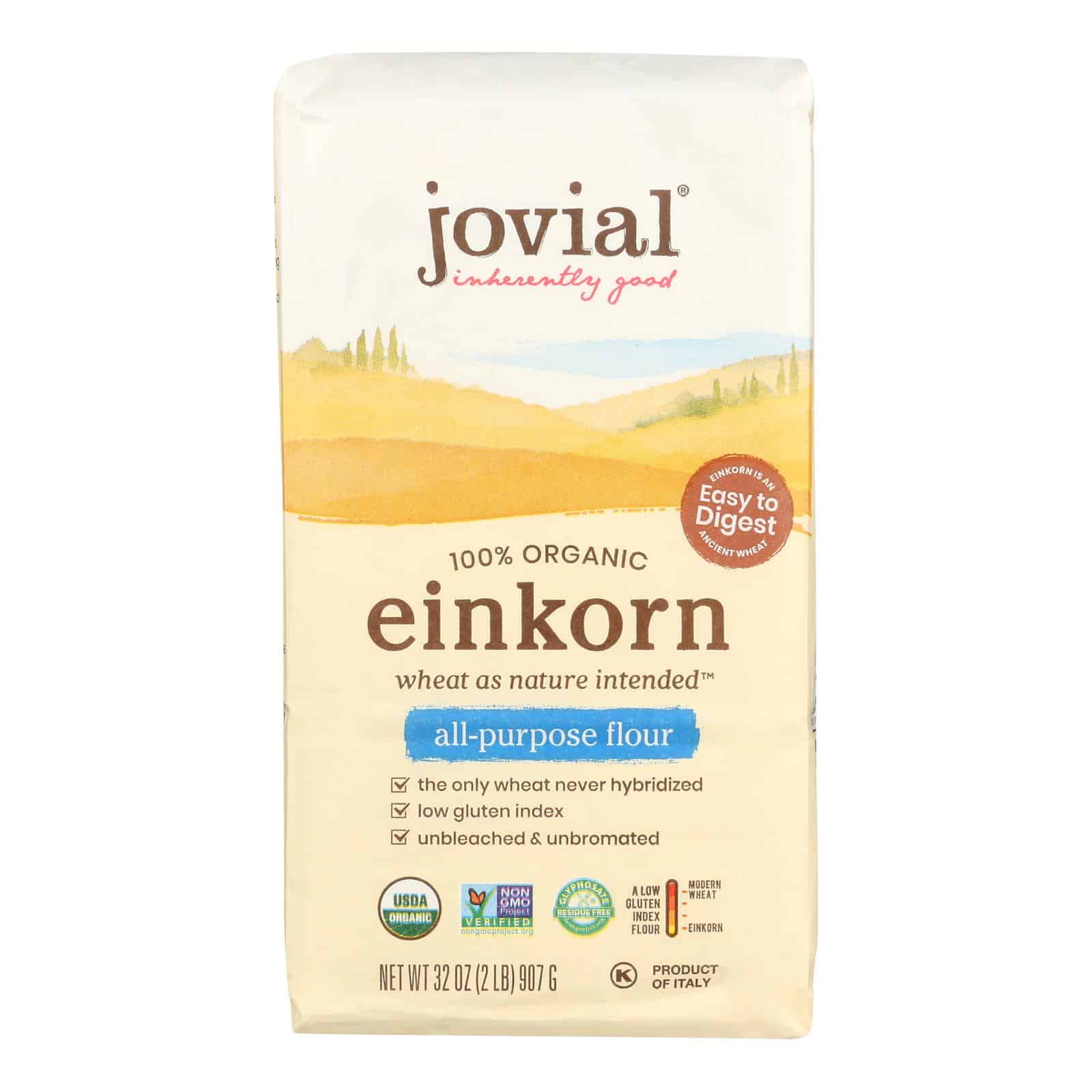JOVIAL EINKORN ALL-PURPOSE FLOUR IS UNBLEACHED AND UNBROMATED WHEAT FLOUR THAT SERVES AS A HEALTHY ALTERNATIVE TO MODERN WHEAT. SUBSTITUTE EINKORN IN YOUR SWEET OR SAVORY BAKING TO GET FLAVORFUL BREAD AND BAKED GOODS WITH A GOLDEN COLOR RICH WITH THE ANTIOXIDANT LUTEIN. EACH 32 OZ. BAG OF EINKORN FLOUR IS CERTIFIED USDA ORGANIC.