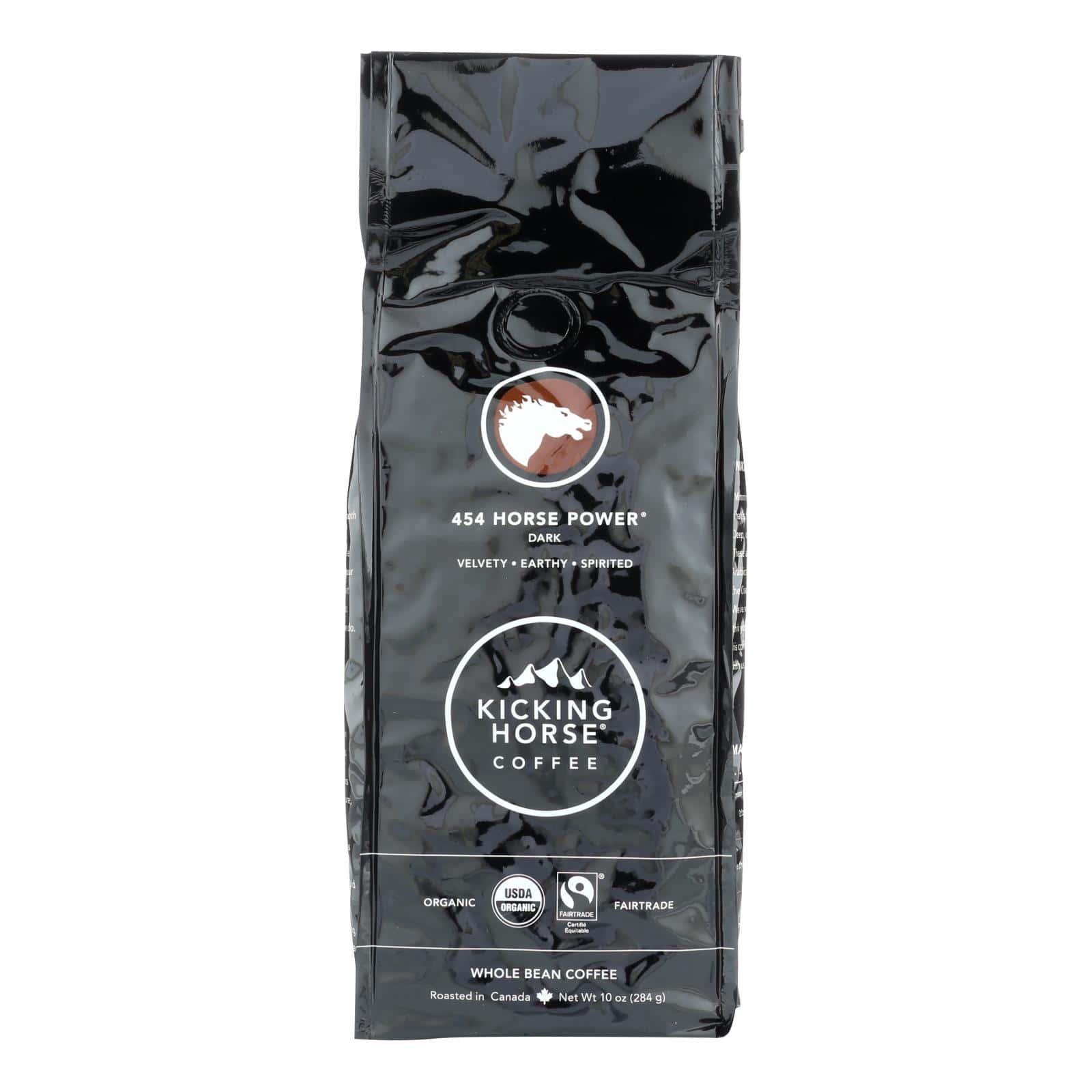 KICKING HORSE COFFEE 454 HORSE POWER WHOLE BEAN COFFEE IS AN EARTHY, SPIRITED DARK ROAST BLEND. OUR COFFEE IS SOURCED FROM INDONESIA, CENTRAL AMERICA AND SOUTH AMERICA. THESE ARE CERTIFIED FAIRTRADE ARABICA BEANS THAT ARE ROASTED IN THE ROCKY MOUNTAINS. EACH 10 OZ. BAG OF WHOLE BEAN COFFEE IS CERTIFIED USDA ORGANIC.
