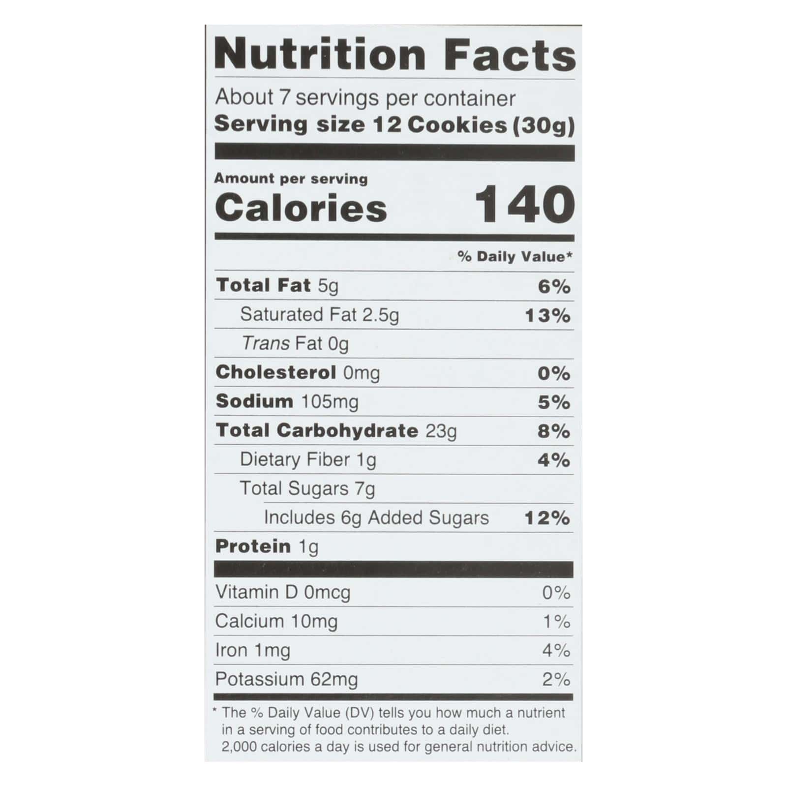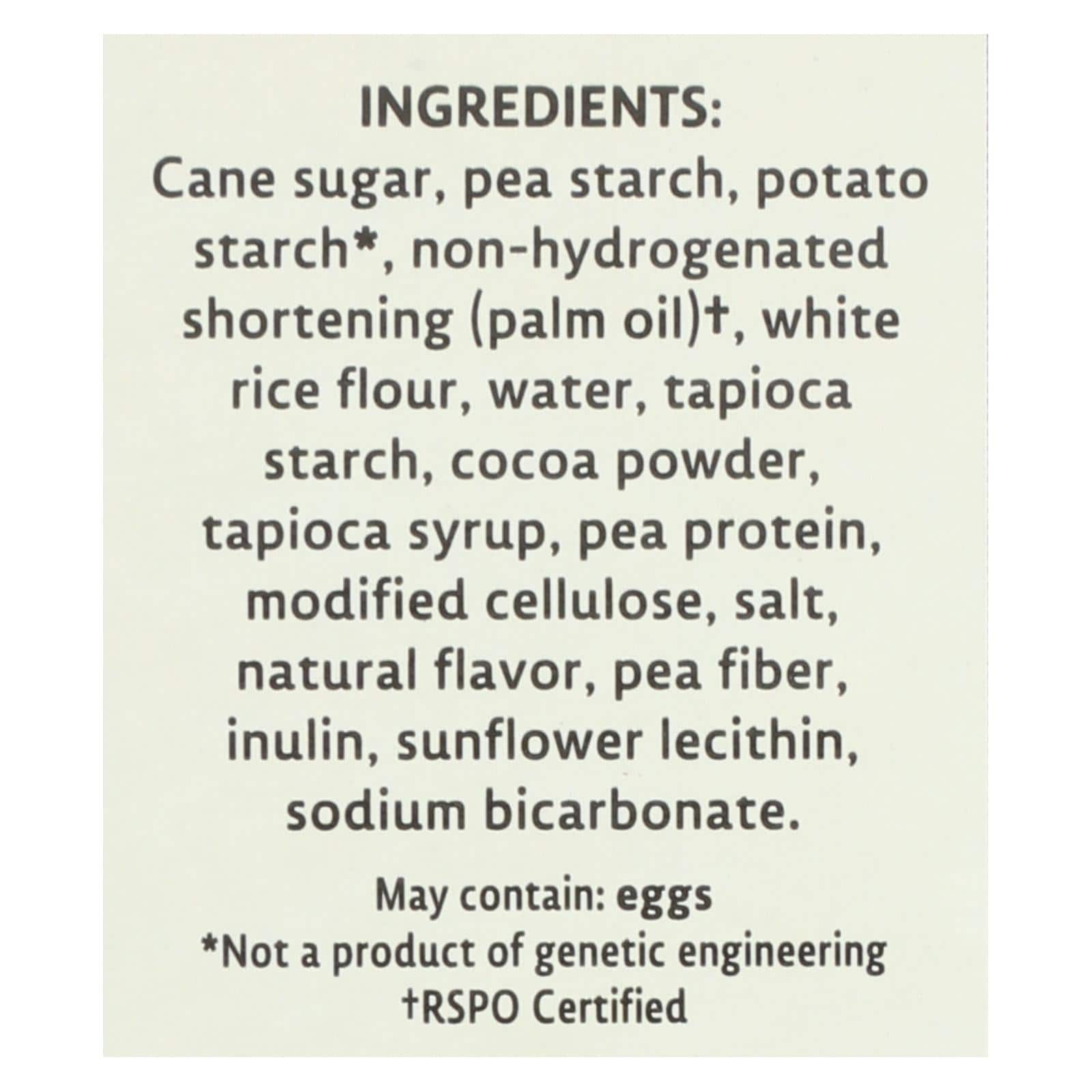 Pea Starch, Non Hydrogenated Palm Oil Shortening palm oil, modified palm oil, Potato Starch, Brown Rice Flour, Brown Sugar, Sweet Rice Flour, Tapioca Starch, Water, Rice Bran, Sugar, Molasses, Liquid Honey, Glucose, Salt, Baking Soda, Pea Protein, Pure Vanilla Extract, Cellulose, Pea Fiber, Guar Gum, Inulin, Soy Lecithin, Mono Calcium Phosphate.