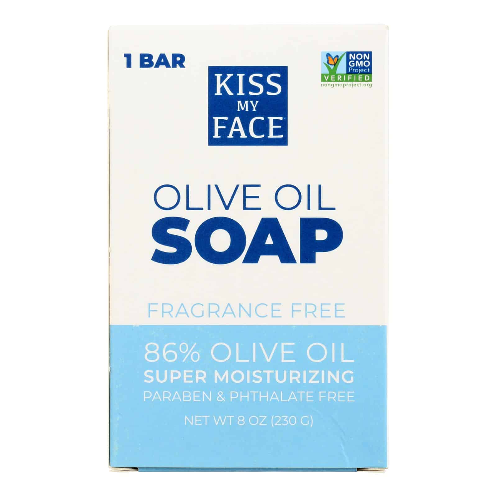 KISS MY FACE OLIVE OIL BAR SOAP IN FRAGRANCE FREE IS A NATURAL WAY TO CLEANSE AND MOISTURIZE YOUR SKIN. OUR CRUELTY-FREE SOAP IS FREE OF ARTIFICIAL COLORS, PHTHALATES AND SYNTHETIC FRAGRANCE. OUR INGREDIENTS ARE NON-GMO PROJECT VERIFIED AND SUITABLE FOR ALL SKIN TYPES. INCLUDES ONE 8 OZ. BAR OF OLIVE OIL BAR SOAP.