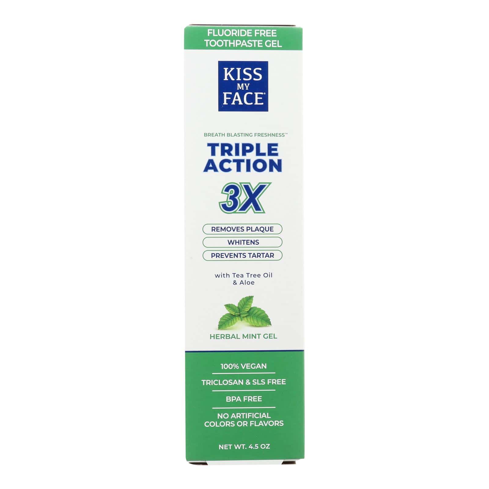 KISS MY FACE TRIPLE ACTION COOL MINT GEL TOOTHPASTE CLEANS YOUR TEETH AND FRESHENS YOUR BREATH THANKS TO A FRESH FLAVOR AND NATURAL INGREDIENTS. THE FORMULA REMOVES PLAQUE, WHITENS AND PREVENTS TARTAR BUILD-UP AS A NORMAL TOOTHPASTE AND CONTAINS ANTIOXIDANTS CO-Q10 AND TEA TREE OIL FOR EXTRA PROTECTION. A 4.5 OZ. TUBE DELIVERS OLIVE LEAF EXTRACT AND PEPPERMINT AS NATURAL BREATH CLEANERS TO LEAVE YOUR MOUTH FEELING REFRESHED.