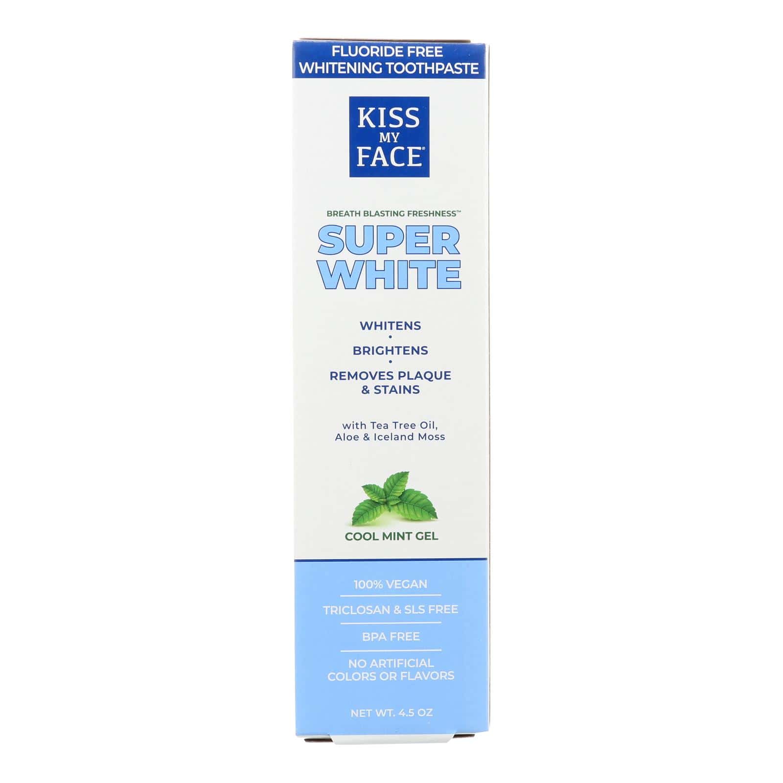 KISS MY FACE WHITENING COOL MINT GEL TOOTHPASTE HELPS ELIMINATE PLAQUE WHILE CREATING WHITER SMILES AND FRESHER BREATH. THE FLUORIDE-FREE FORMULA INCLUDES THE ANTIOXIDANTS TEA TREE OIL AND ICELANDIC MOSS EXTRACT AS WELL AS NATURAL ALOE AND XYLITOL. THIS GEL TOOTHPASTE HAS A PLEASANT PEPPERMINT TASTE. NEVER TESTED ON ANIMALS, THIS PRODUCT IS MADE WITHOUT ARTIFICIAL COLORS OR FLAVORS. EACH BOX INCLUDES ONE TUBE CONTAINING 4.5 OZ. OF TOOTHPASTE.