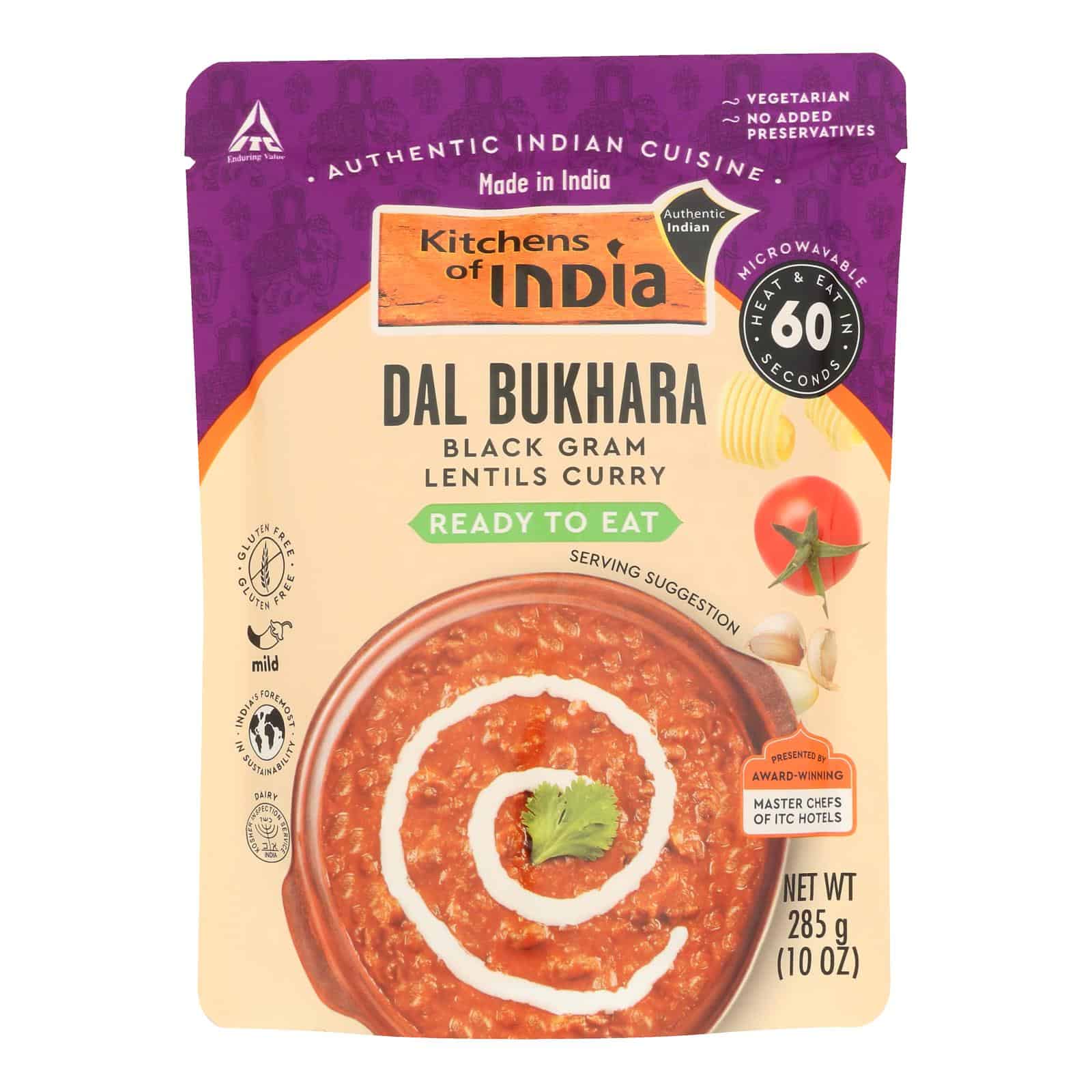 KITCHENS OF INDIA DAL BUKHARA BLACK GRAM LENTILS CURRY IS AN AUTHENTIC AND ALL-NATURAL INDIAN RECIPE FEATURING THE ROBUST FLAVORS OF WHOLE BLACK GRAM LENTILS SIMMERED FOR HOURS IN A THICK TOMATO GRAVY. OUR GLUTEN-FREE AND VEGETARIAN DAL BUKHARA COMES IN ONE 10 OZ. PACKAGE AND IS READY TO HEAT AND EAT.