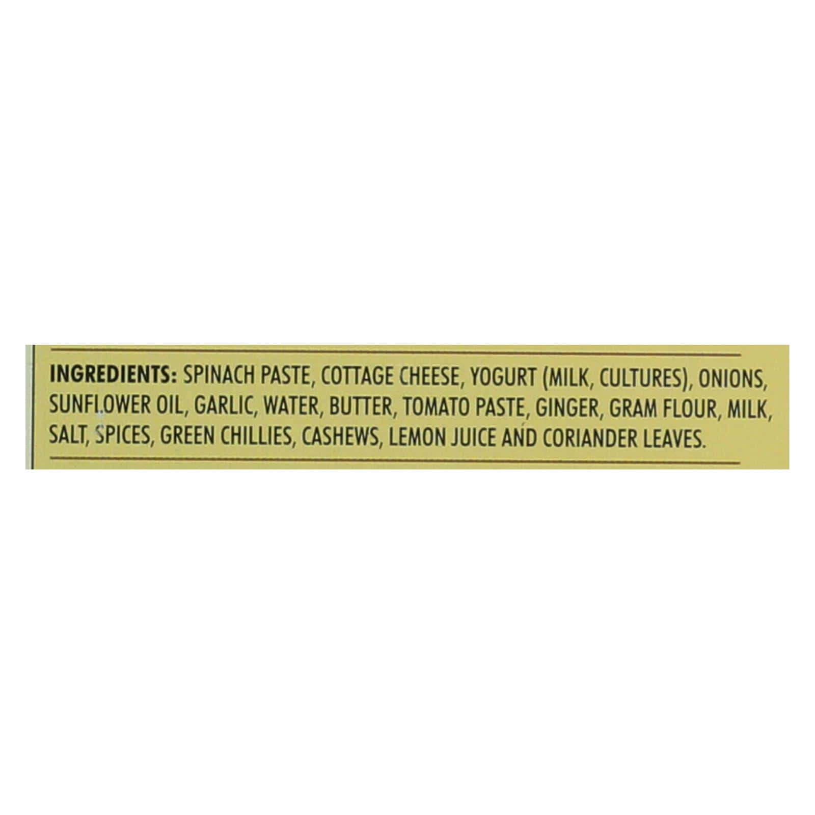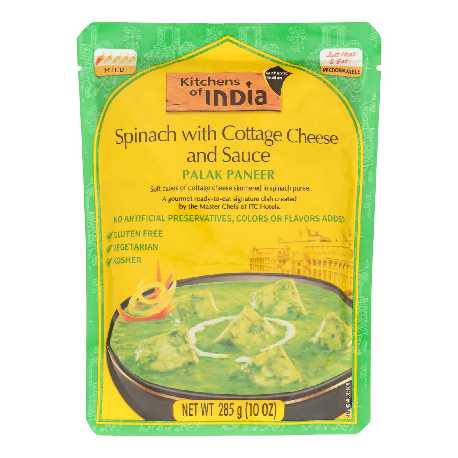 KITCHENS OF INDIA PALAK PANEER SPINACH WITH COTTAGE CHEESE AND SAUCE IS AN AUTHENTIC AND ALL-NATURAL INDIAN RECIPE FEATURING SOFT CUBES OF COTTAGE CHEESE SIMMERED IN A FRESH SPINACH PUREE. OUR ALL-NATURAL VEGETARIAN DISH IS FREE OF GLUTEN AND PRESERVATIVES. PALAK PANEER COMES IN ONE 10 OZ. PACKAGE AND IS READY TO HEAT AND EAT.