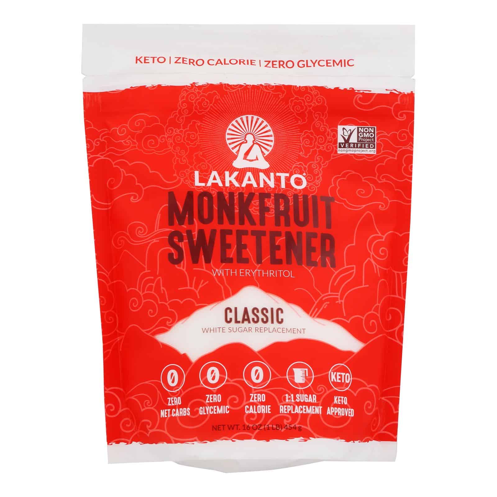 LAKANTO MONK FRUIT SWEETENER SWEETENS YOUR RECIPES JUST LIKE SUGAR, BUT CONTAINS NO CALORIES OR FAT. THIS ZERO-GLYCEMIC SWEETENER USES HIGH-PURITY MONK FRUIT EXTRACT AND NON-GMO ERYTHRITOL, A NATURAL SUGAR ALCOHOL FROM CERTAIN FRUITS AND VEGETABLES, MAKING IT A VEGAN ALTERNATIVE. WITH JUST AS MUCH SWEETNESS AS SUGAR, THIS HEALTHIER SWEETENER WORKS ON A ONE-TO-ONE REPLACEMENT BASIS FOR COOKING, BAKING AND OTHER USES FOR EASY SWAPPING. EACH 1 LB. BAG CONTAINS ENOUGH SWEETENER FOR 311 SERVINGS.