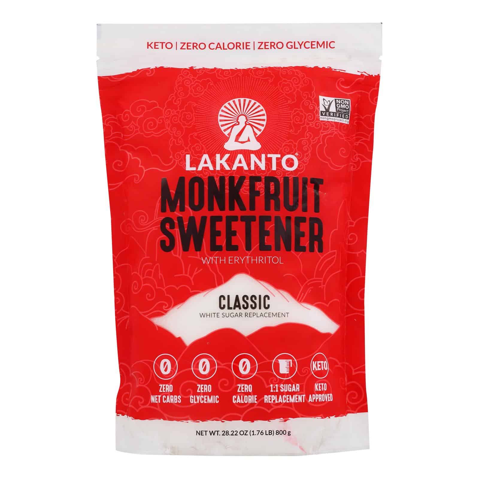 LAKANTO’S CLASSIC MONKFRUIT SWEETENER IS A PERFECT 1:1 SUGAR SUBSTITUTE MADE WITH ERYTHRITOL AND MONK FRUIT EXTRACT HARVESTED ACCORDING TO TRADITIONAL AND ENVIRONMENTAL METHODS. OUR SWEETENER IS KOSHER CHECK CERTIFIED, NON-GMO PROJECT VERIFIED, HAS ZERO CALORIES AND NO ADDITIVES. MONK FRUIT SWEETENER IS VEGAN FRIENDLY, GLUTEN-FREE AND COOKS, BAKES AND TASTES JUST LIKE SUGAR. INCLUDED IS ONE 28.22 OZ. BAG OF LAKANTO CLASSIC MONKFRUIT SWEETENER.