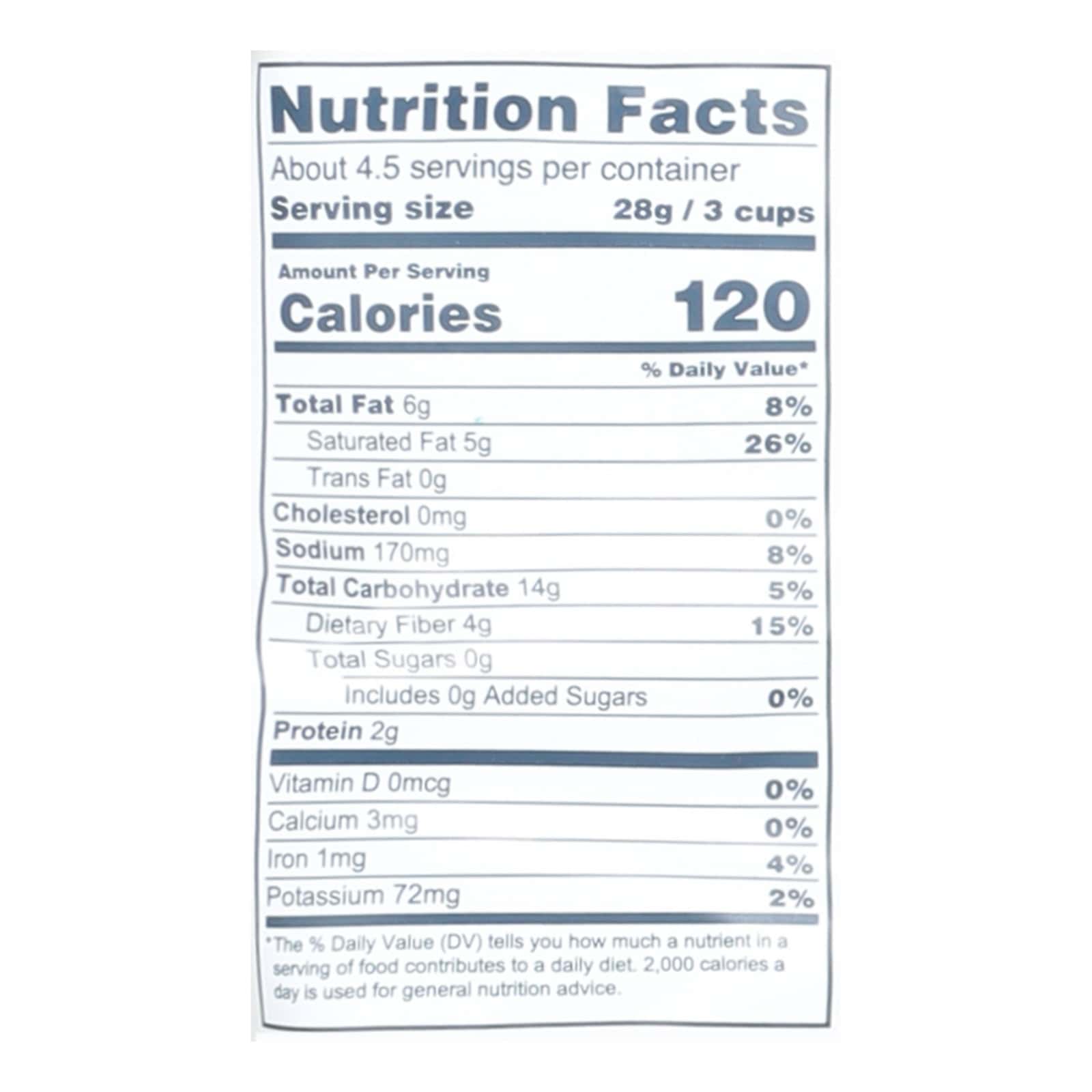 LESSEREVIL BUDDHA BOWL HIMALAYAN GOLD BUTTER FLAVORED COCONUT OIL ORGANIC POPCORN USES A NUTRITIOUS PLANT-BASED ALTERNATIVE FOR A GREAT BUTTERY TASTE. THIS POPCORN IS CHOLESTEROL-FREE, WHOLE GRAIN, VEGAN AND CONTAINS ONLY 110 CALORIES PER SERVING. IT?S ALSO GLUTEN-FREE, USDA ORGANIC AND NON-GMO. INCLUDES ONE 5 OZ. BAG OF LESSEREVIL POPCORN. SEE NUTRITION FACTS PANEL FOR ALLERGENS. AT LESSEREVIL, WE CHOOSE ORGANIC BECAUSE ORGANIC FOODS ARE GROWN WITHOUT TOXIC PESTICIDES, SYNTHETIC FERTILIZERS OR GENETIC ENGINEERING AND PROVIDE SUSTAINABLE FARMING PRACTICES TO PROTECT ENVIRONMENTAL HEALTH WHILE IMPROVING IT. WE BELIEVE IT?S BETTER FOR THE PLANET AND BETTER FOR YOU.