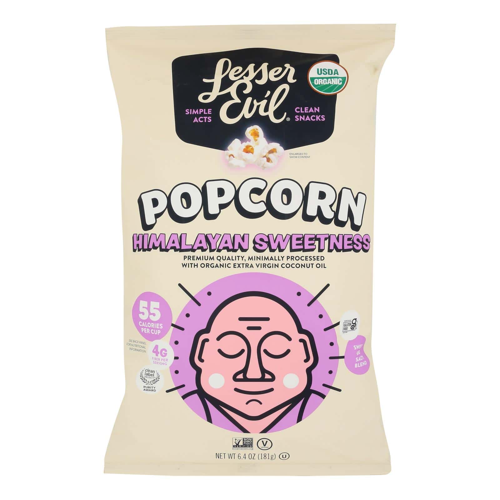 LESSEREVIL BUDDHA BOWL HIMALAYAN SWEETNESS SWEET AND SALTY ORGANIC POPCORN IS FRESH, TENDER AND LIGHT POPCORN MADE WITH ORGANIC COCONUT OIL AND HIMALAYAN PINK SALT. THIS POPCORN IS CHOLESTEROL-FREE, WHOLE GRAIN, VEGAN AND CONTAINS ONLY 110 CALORIES PER SERVING. IT?S ALSO GLUTEN-FREE, USDA ORGANIC AND NON-GMO. INCLUDES ONE 7 OZ. BAG OF LESSEREVIL POPCORN. SEE NUTRITION FACTS PANEL FOR ALLERGENS. AT LESSEREVIL, WE CHOOSE ORGANIC BECAUSE ORGANIC FOODS ARE GROWN WITHOUT TOXIC PESTICIDES, SYNTHETIC FERTILIZERS OR GENETIC ENGINEERING AND PROVIDE SUSTAINABLE FARMING PRACTICES TO PROTECT ENVIRONMENTAL HEALTH WHILE IMPROVING IT. WE BELIEVE IT?S BETTER FOR THE PLANET AND BETTER FOR YOU.