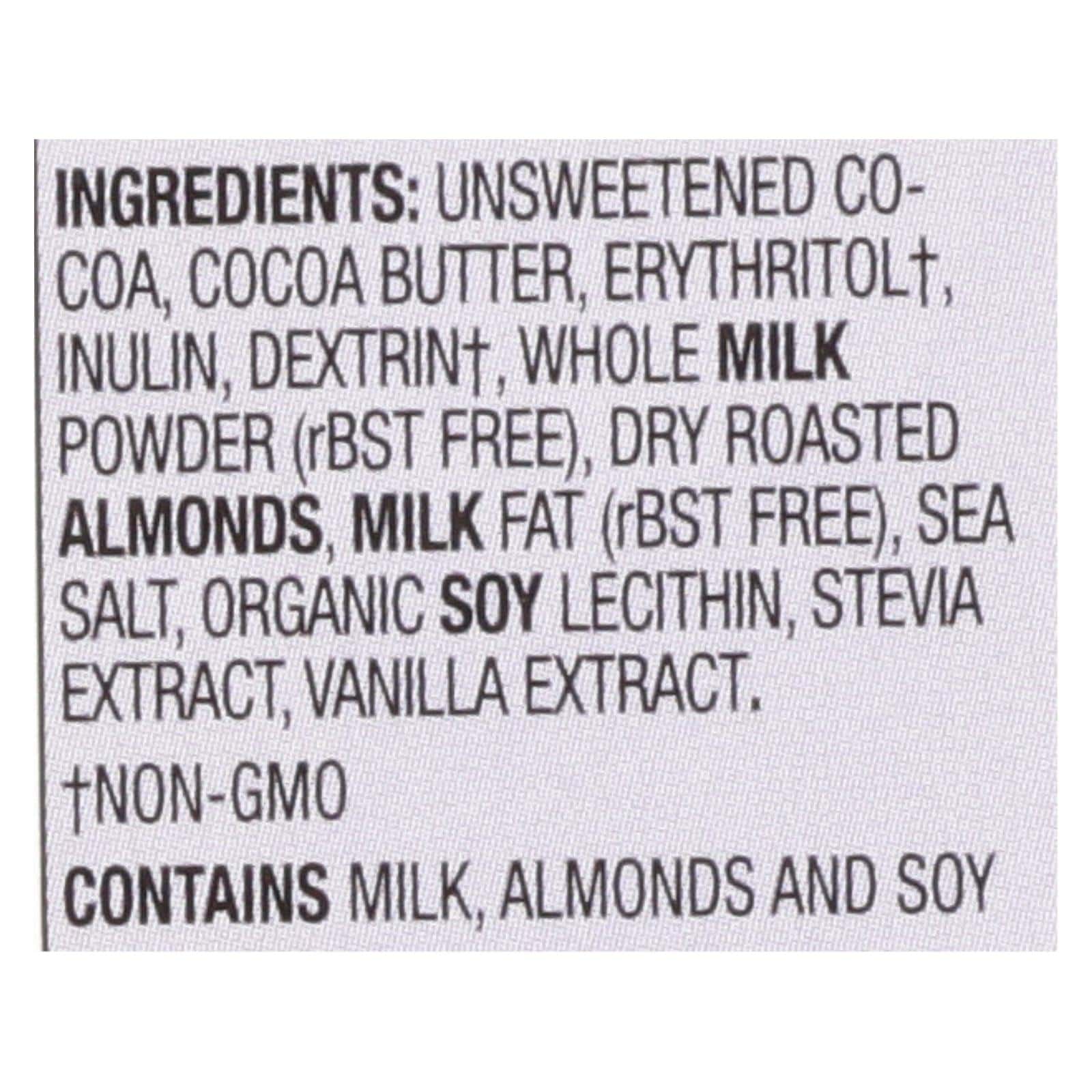 LILY’S SALTED ALMOND & MILK CHOCOLATE BAR IS STEVIA SWEETENED WITH NO SUGAR ADDED FOR A RICH FLAVOR WITHOUT AN EXCESS OF CALORIES. IN ADDITION TO THE RICH FLAVOR IN EACH BITE, THIS TREAT OFFERS MANY HEALTH BENEFITS. OUR GLUTEN-FREE CHOCOLATE BAR IS MADE FROM NON-GMO INGREDIENTS AND IS CERTIFIED AS A FAIR TRADE PRODUCT. EACH 3 OZ. BAR HAS JUST 170 CALORIES AND IS MADE WITH ORGANIC WHOLE MILK POWDER.