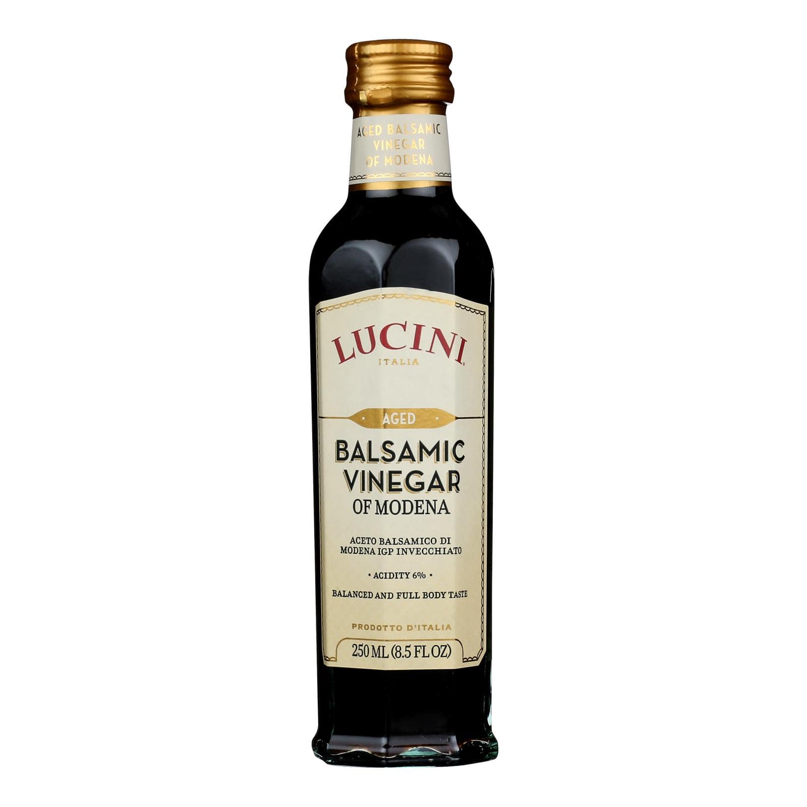 LUCINI ITALIA AGED BALSAMIC VINEGAR OF MODENA IS AGED IN WOODEN CASKS TO ALLOW THE FLAVOR TO DEVELOP NATURALLY. WITH ITS FULL-BODIED TASTE AND AROMA, THIS BALSAMIC VINEGAR ADDS ROBUST FLAVOR TO SALAD DRESSINGS AND GRILLED MEATS AND VEGETABLES. IT ALSO ENLIVENS EGG DISHES, CHEESES AND RISOTTO. ADD A SPLASH OF BALSAMIC VINEGAR TO GIVE SAUCES AND MARINADES AN EXTRA KICK. THIS BOTTLE CONTAINS 8.5 FL. OZ. OF BALSAMIC VINEGAR.