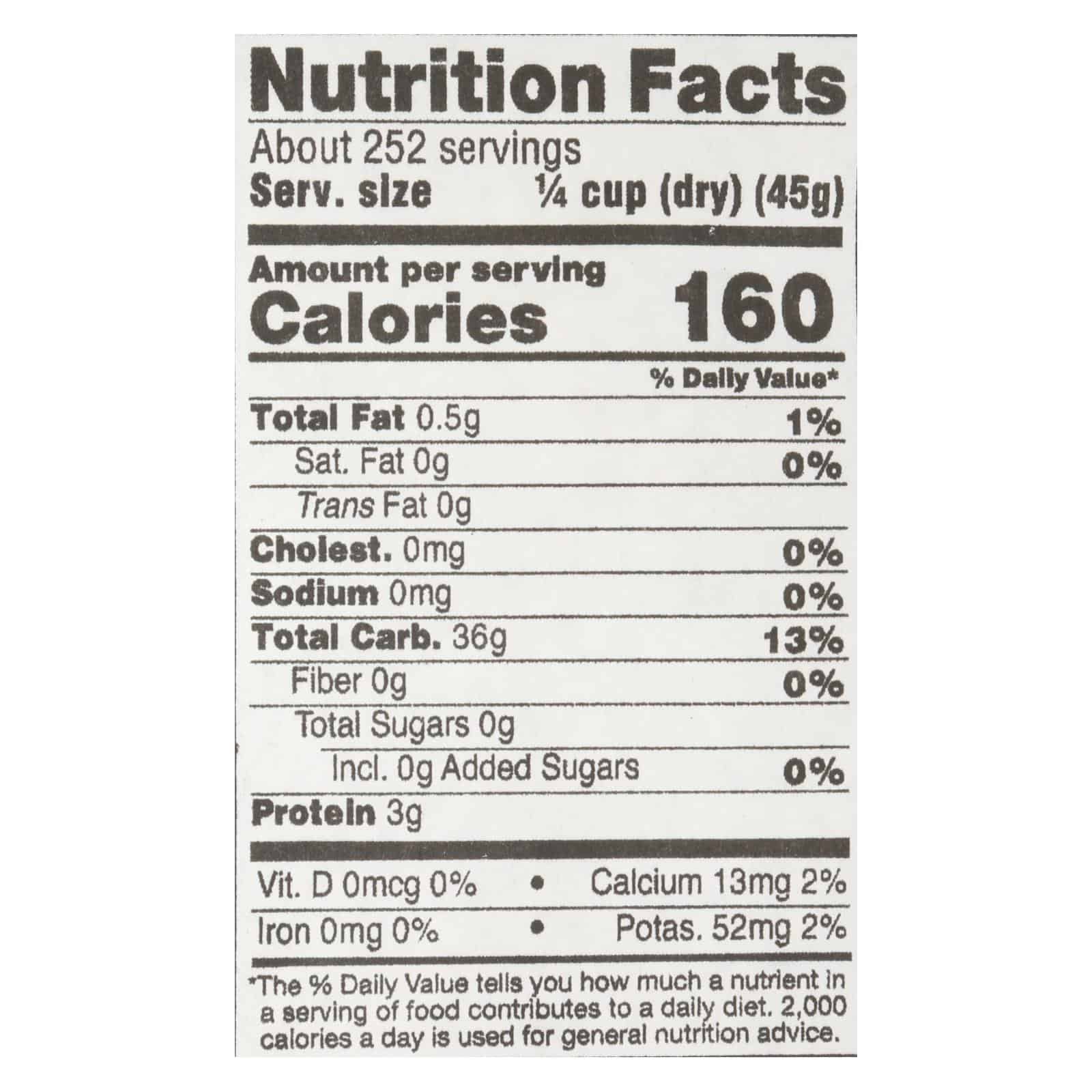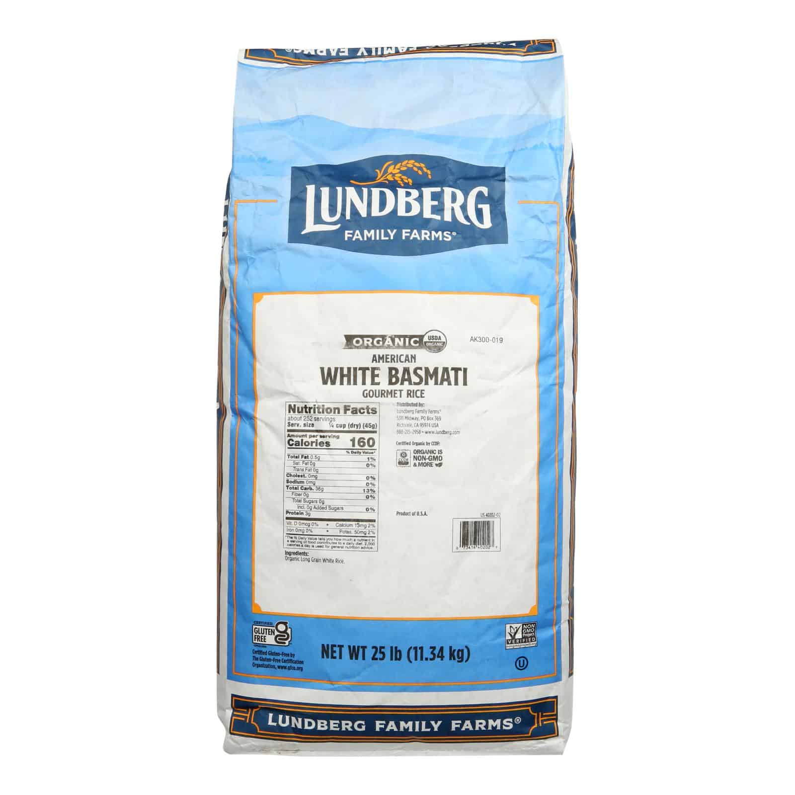 LUNDBERG FAMILY FARMS WHITE BASMATI RICE, GROWN IN CALIFORNIA, OFFERS A DELIGHTFUL AND HEALTHY ADDITION TO YOUR MEALS. A PERFECT ACCOMPANIMENT TO RECIPES WHEN POTATOES JUST WON’T DO. BASMATI IS A FOOD YOU CAN ENJOY AND FEEL GOOD ABOUT EATING. THIS DELICATELY FLAVORED PRODUCT IS A DELICIOUS, ORGANIC LONG GRAIN RICE AND PROVIDES THE ADDITIONAL ADVANTAGE OF BEING KOSHER AND GLUTEN FREE. PURE ORGANIC CALIFORNIA BASMATI RICE. EACH BAG OF LUNDBERG FAMILY FARMS WHITE BASMATI RICE CONTAINS ABOUT 25 POUNDS OF PRODUCT, AND ABOUT 252 SERVINGS. THERE ARE 160 CALORIES PER SERVING. SEE NUTRITION PANEL FOR ALLERGENS. ENJOY THIS VERY TASTY COMPLEMENT TO A HEALTHY DIET.