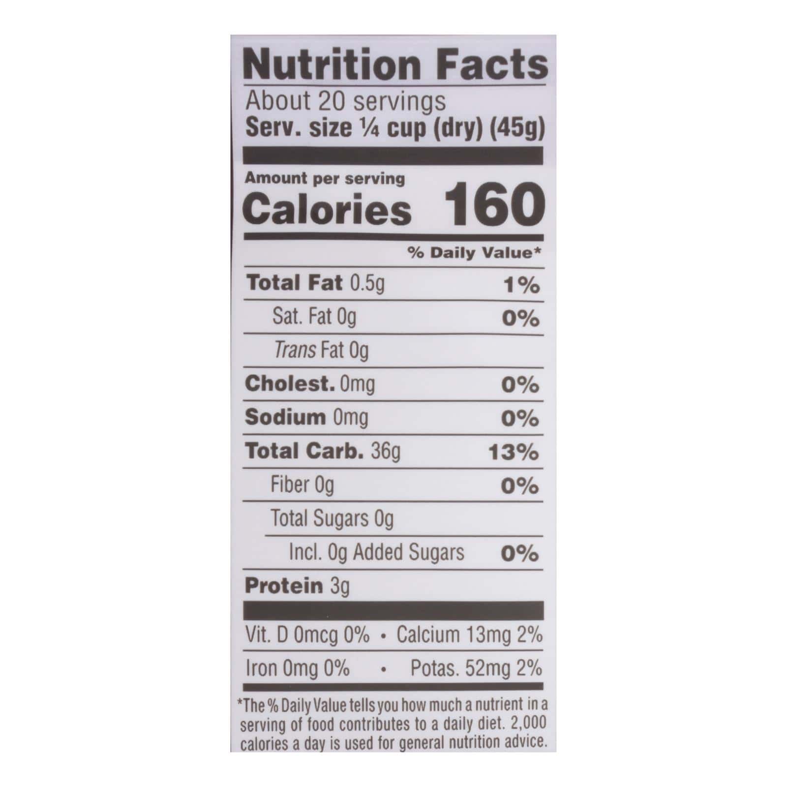 LUNDBERG FAMILY FARMS CALIFORNIA WHITE BASMATI RICE IS A NATURAL, NON-GMO WHOLE GRAIN. FREE FROM ANY ADDITIVES OR OTHER SUBSTANCES, THIS RICE IS PURE AND NUTRIENT RICH. LUNDBERG FAMILY FARMS RICE IS MANUFACTURED WITH RENEWABLE ENERGY AND SUSTAINABLE METHODS. THIS PRODUCT IS GLUTEN-FREE, KOSHER AND ORGANIC. EACH BAG OF LUNDBERG FAMILY FARMS CALIFORNIA WHITE BASMATI RICE WEIGHS 32 OZ. WITH 20 SERVINGS PER BAG AND 160 CALORIES PER SERVING. STORE IN A COOL, DRY PLACE. SEE NUTRITION FACTS PANEL FOR ALLERGENS.