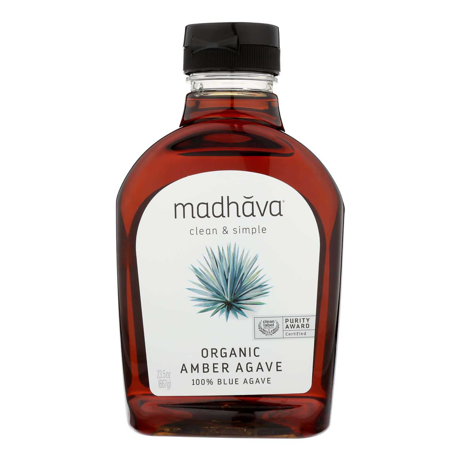 MADHAVA ORGANIC BLUE AGAVE LOW-GLYCEMIC SWEETENER, AMBER RAW, IS AN ALL-NATURAL SUGAR REPLACEMENT MADE FROM THE JUICE OF THE AGAVE PLANT. IT?S A SIMPLE PLANT-BASED FOOD THAT IS A HEALTHY ALTERNATIVE TO PROCESSED SUGAR AND ARTIFICIAL SWEETENERS. THE AMBER RAW VARIETY HAS A RICH, FULL FLAVOR. THIS PRODUCT IS ORGANIC, GLUTEN FREE, NON-GMO, VEGAN AND PARVE KOSHER. THIS BOTTLE OF MADHAVA ORGANIC BLUE AGAVE LOW-GLYCEMIC SWEETENER CONTAINS 23.5 OZ. OF PRODUCT.