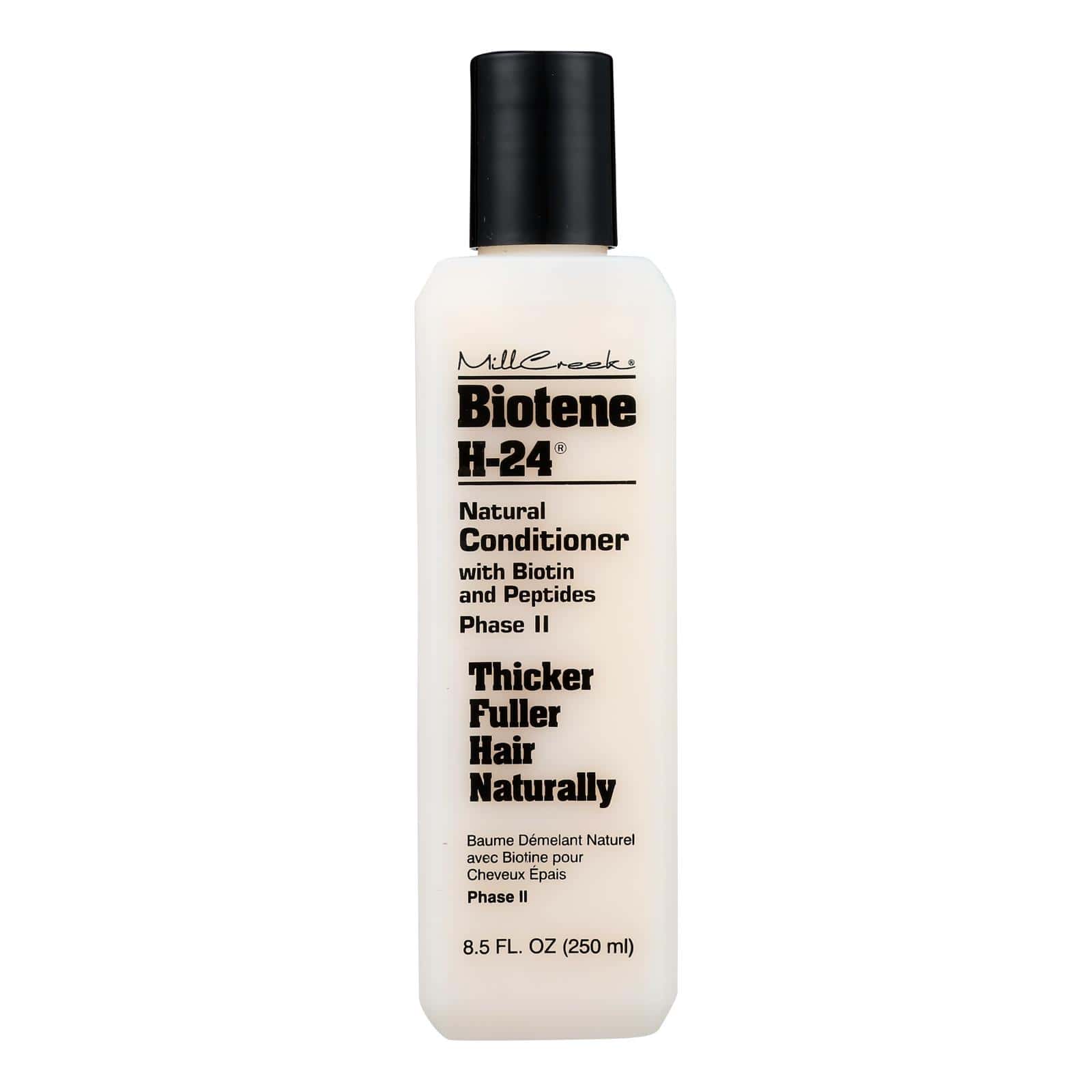 MILLCREEK BOTANICALS BIOTENE H-24 NATURAL CONDITIONER WITH BIOTIN PHASE II CONTAINS ORGANIC ALOE VERA GEL AND BOTANICAL EXTRACTS TO HELP NATURALLY CONDITION YOUR HAIR AS PART OF YOUR HAIR MAINTENANCE ROUTINE. OUR CRUELTY-FREE CONDITIONER CONTAINS ESSENTIAL OILS AND IS PH-BALANCED. BIOTENE H-24 NATURAL CONDITIONER WITH BIOTIN PHASE II COMES IN A 8.5 FL. OZ. BOTTLE.