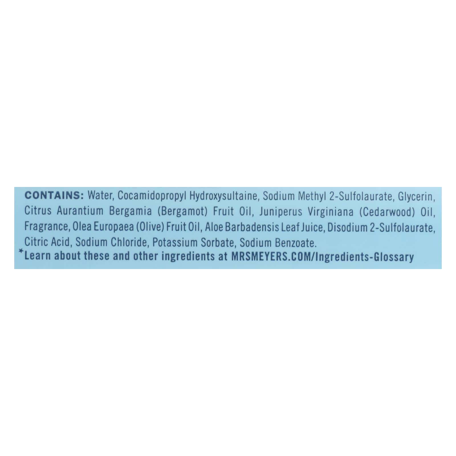 Hardworking homekeeping. Aromatherapeutic household products. Creating clean and happy homes since 2001. Tough on dirt and grime. Gentle on your home. Drops of rain water fall on leaves and noses and fill the air. A scent so clean, hinting of white flower. Splash in a puddle! Made with olive oil & aloe vera (Learn about these and other ingredients at mrsmeyers.com/ingredients-glossary). We make effective, trusted formulas. Made with (Learn about these and other ingredients at mrsmeyers.com/ingredients-glossary): Plant derived ingredients; Essential oils; Aloe vera extract; Glycerin & olive oil. Made without: Parabens & phthalates; MEA & DEA; Artificial colors. mrsmeyers.com. how2recycle.info. Bottle (less cap) made with at least 30% post-consumer plastic. Contents are biodegradable. Cruelty-free.