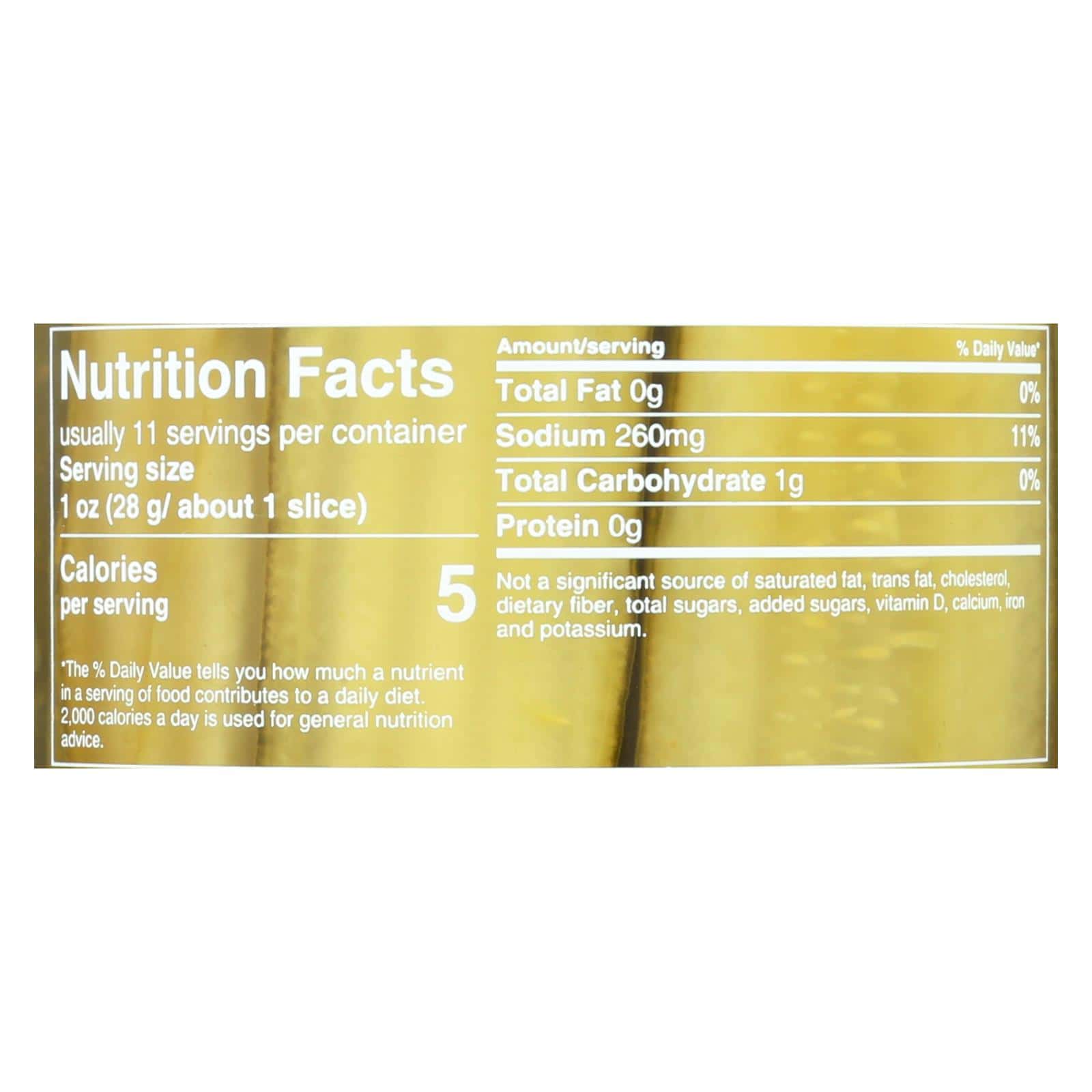 USDA Organic. Certified Organic by Baystate Organic Certifiers. Gluten free. Vegan. No saturated fat. Low calorie. Cholesterol free. No GMO. New! Since 1926. Fresh pack. No: high fructose corn syrup; yellow no. 5. www.mtolivepickles.com. Visit MtOlivePickles.com. Please recycle.
