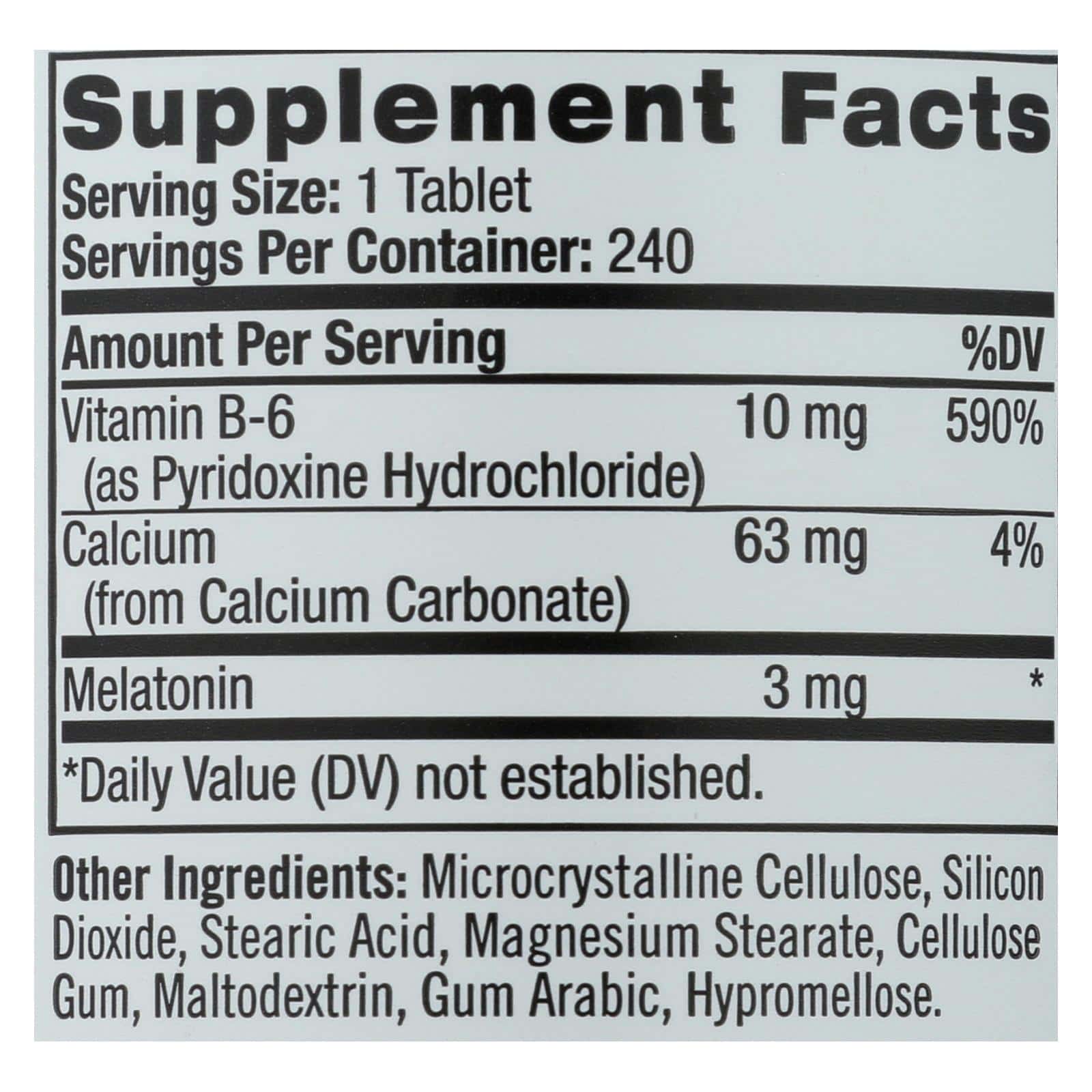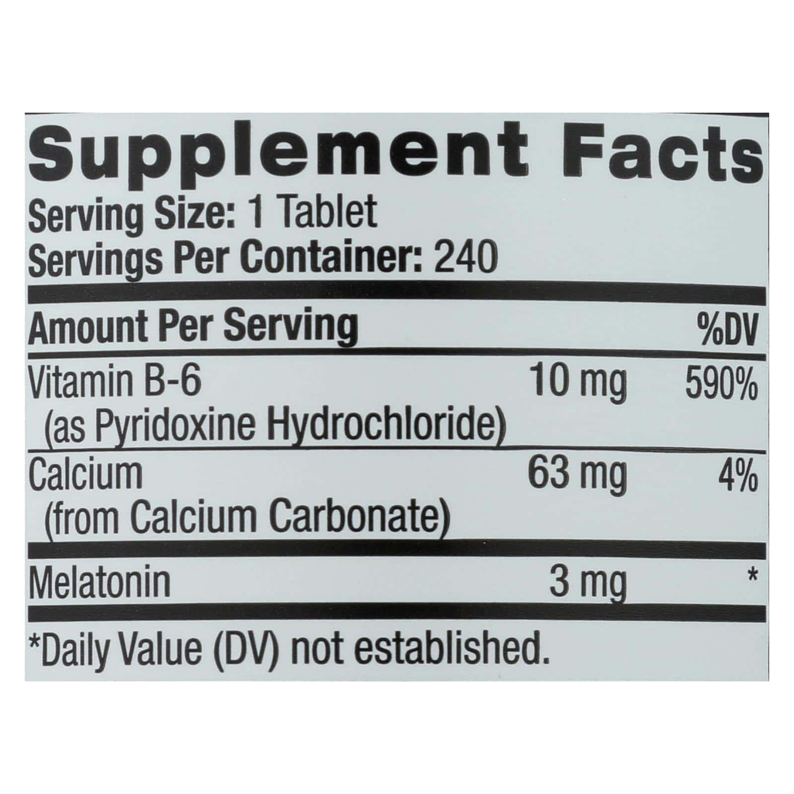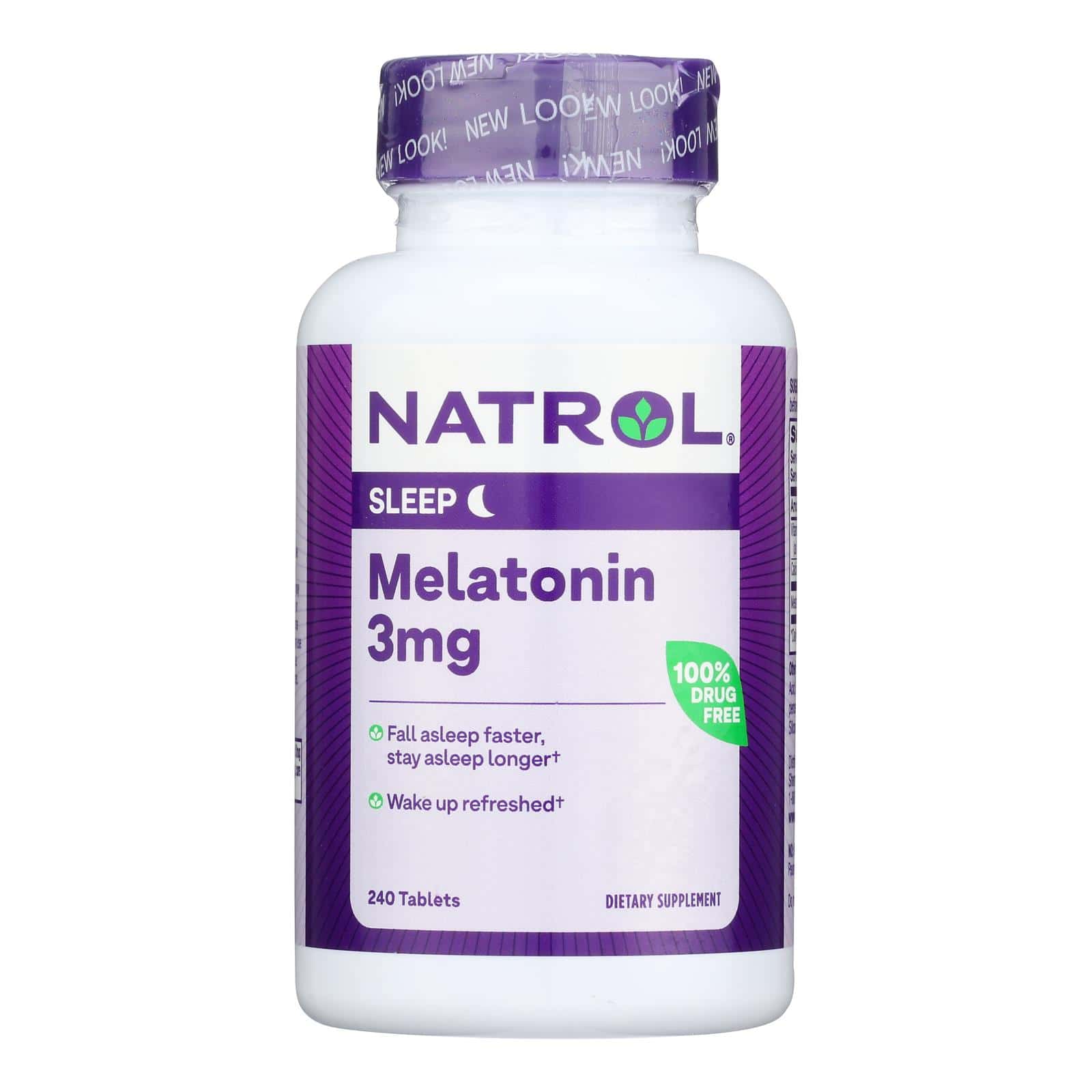 NATROL MELATONIN DRUG-FREE NIGHTTIME SLEEP AID DIETARY SUPPLEMENT DELIVERS 3 MG. PER TABLET OF MELATONIN AND 10 MG. PER TABLET OF VITAMIN D6 TO PROMOTE NORMAL SLEEP PATTERNS. OUR BODIES PRODUCE MELATONIN NATURALLY TO MANAGE OUR SLEEP CYCLES, BUT AGING, STRESS, POOR DIET, LACK OF EXERCISE AND OTHER CAUSES CAN DISRUPT ITS PRODUCTION. THE MELATONIN IN THIS 240 COUNT BOTTLE HELPS YOU GET TO SLEEP AND TO SLEEP MORE SOUNDLY, WITHOUT THE USE OF DRUGS.