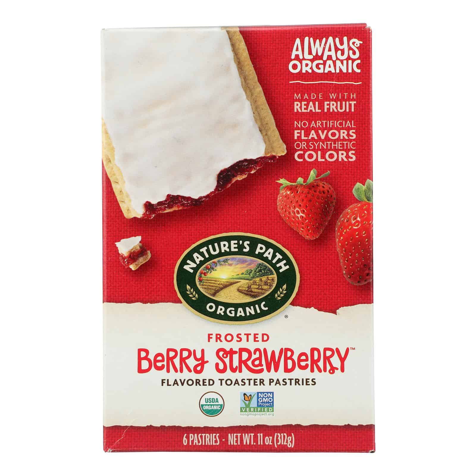 NATURE’S PATH TOASTER PASTRIES, BERRY STRAWBERRY FROSTED ARE ORGANIC AND NATURALLY FLAVORED. WE CREATE THEM FROM REAL FRUIT AND WHOLE GRAINS. WE USE RESPONSIBLY SOURCED, KOSHER INGREDIENTS THAT ARE NON-GMO, USDA ORGANIC AND FAIR TRADE CERTIFIED. EACH BOX CONTAIN 6 PASTRIES. SEE NUTRITION FACTS PANEL FOR ALLERGENS.