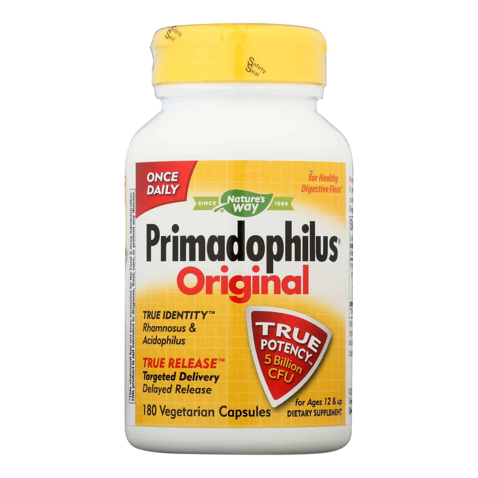 NATURE’S WAY DIETARY SUPPLEMENT PRIMADOPHILUS ORIGINAL CAPSULES MAY PROMOTE DIGESTIVE HEALTH AND HEALTHY DIGESTIVE FLORA. WE CREATED THIS FORMULA WITH A PROPRIETARY BLEND OF PROBIOTICS WHICH INCLUDES 5 BILLION LACTOBACILLI. THESE CAPSULES ARE ENTERIC-COATED FOR TARGETED DELIVERY. THIS PACKAGE CONTAINS 180 CAPSULES.